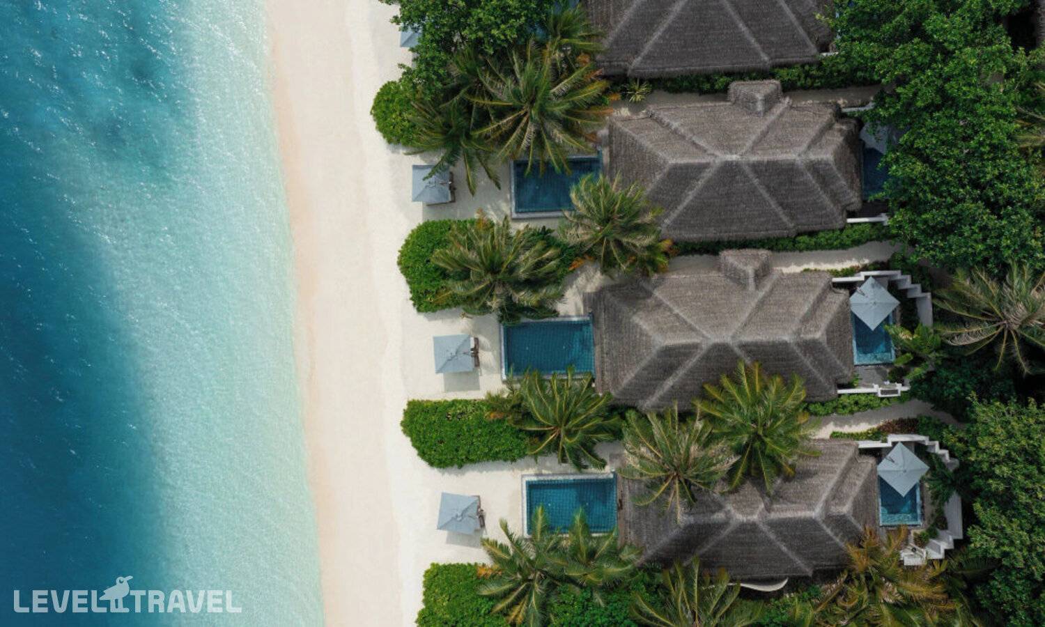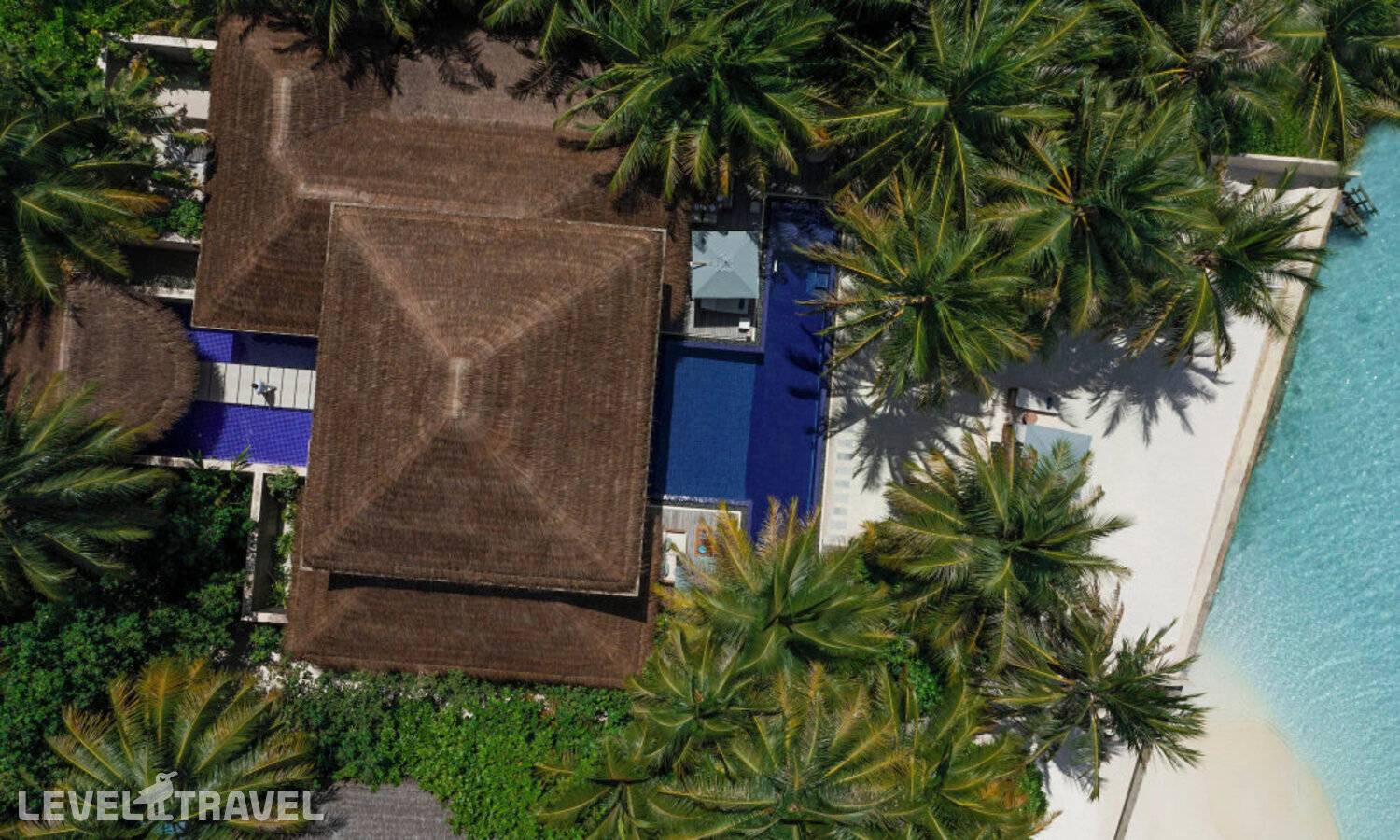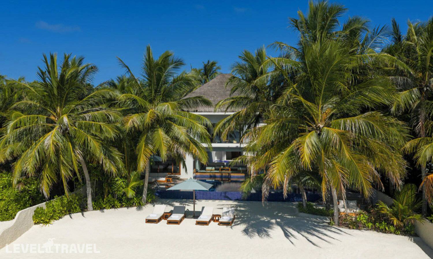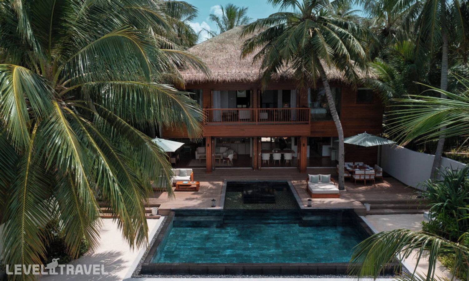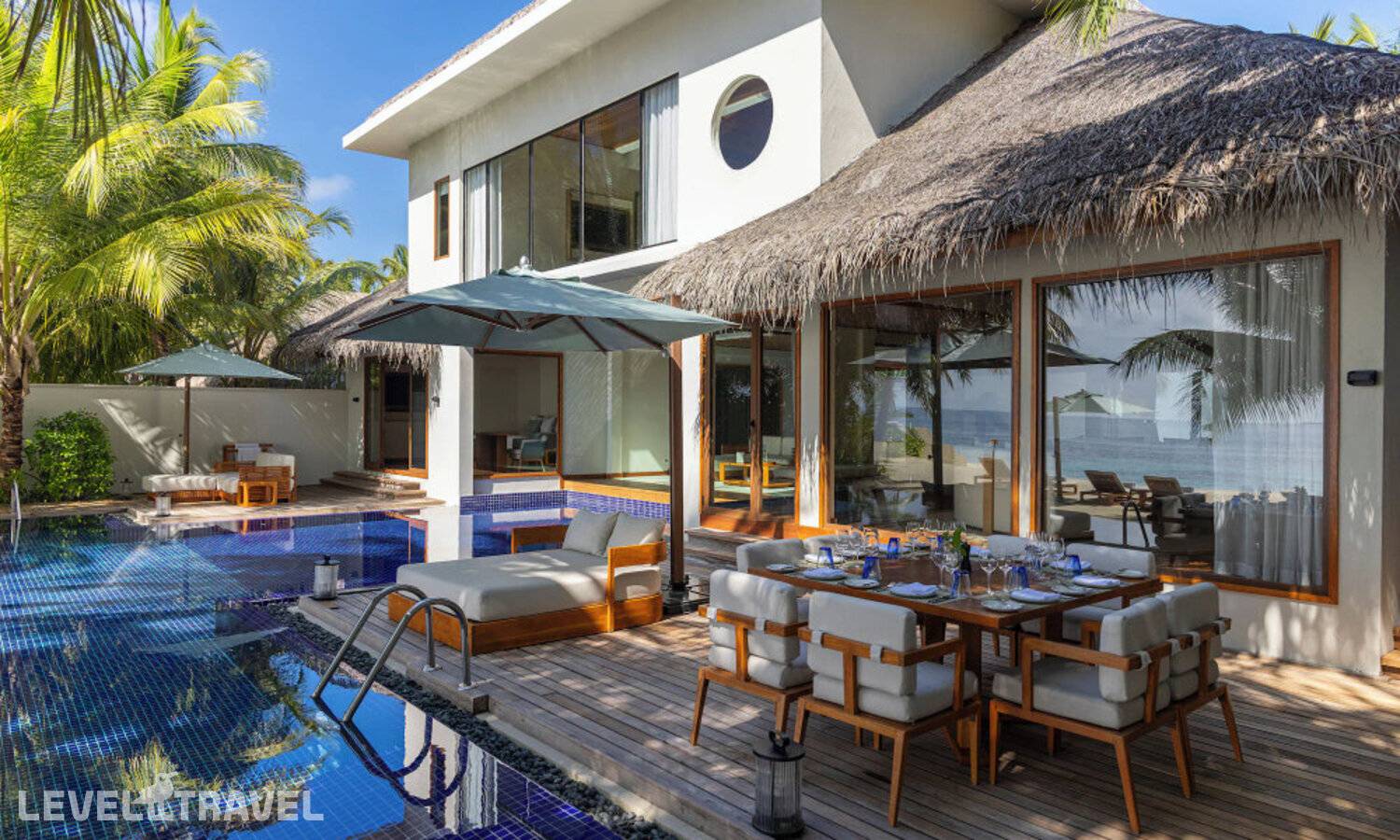Частная двухэтажная пляжная вилла с тремя спальнями; на втором этаже спальня с двуспальной кроватью king-size, ванная комната с душем, на первом этаже две спальни с двумя односпальными кроватями queen-size, ванная комната на открытом воздухе с гидромассажной ванной и топическим душем, зона спа-процедур на открытом воздухе, отдельная столовая с обеденной зоной и гостиная, открытая терраса с бассейном, обеденной зоной и прямым выходом к пляжу