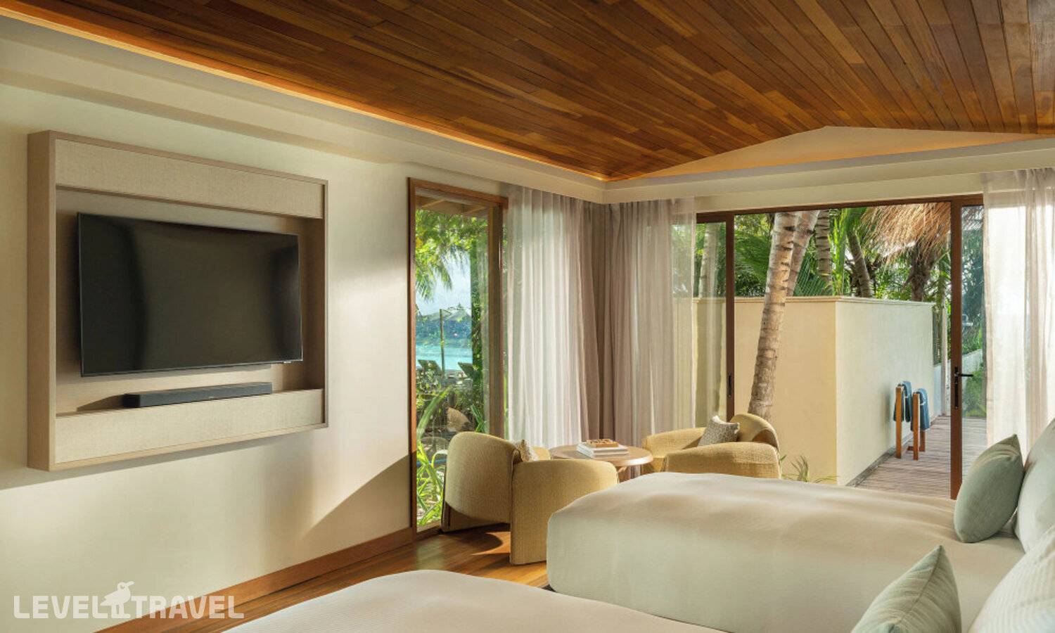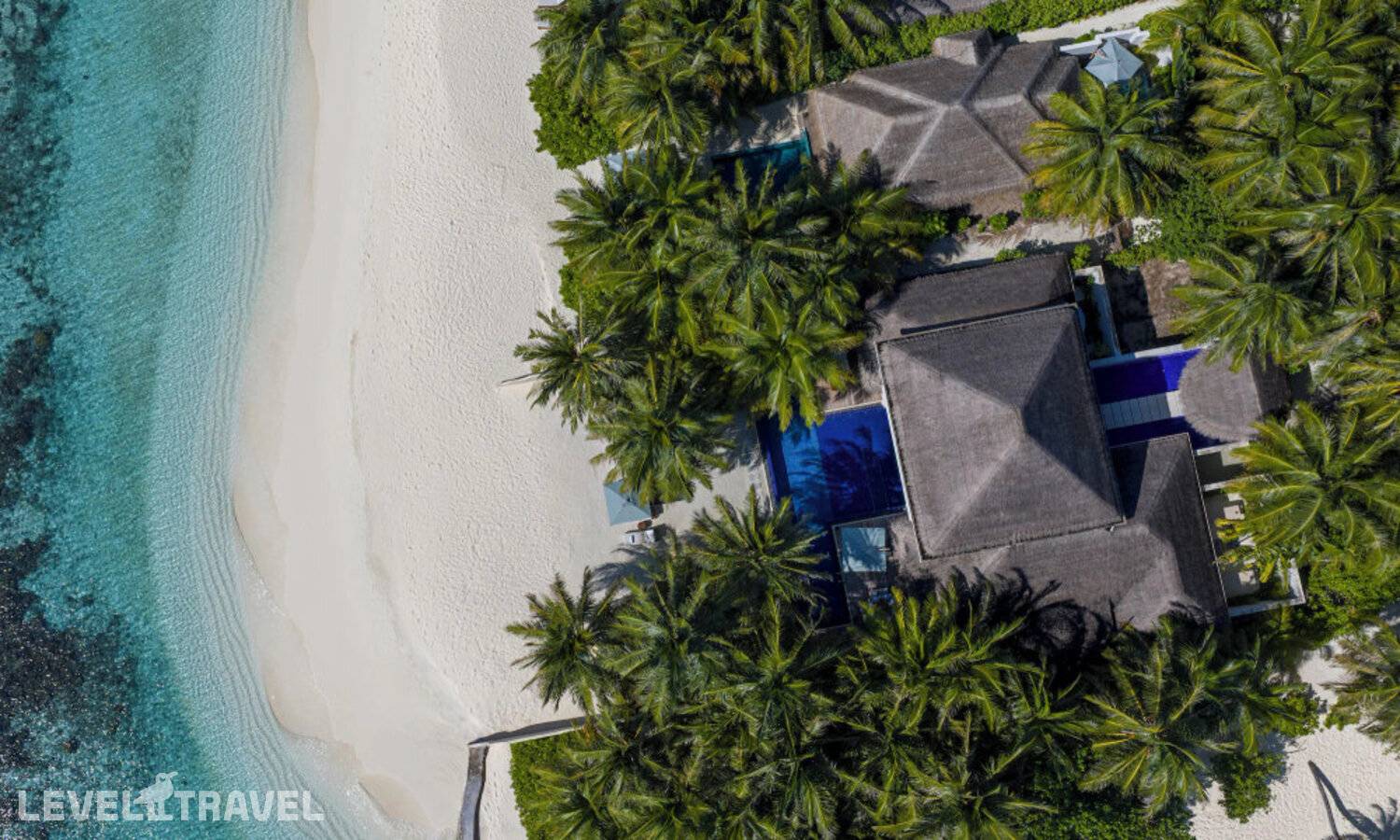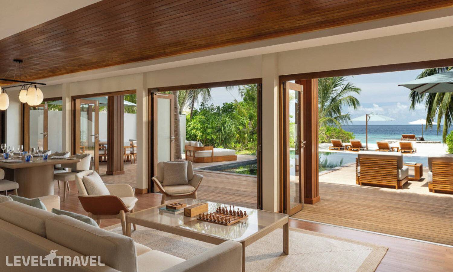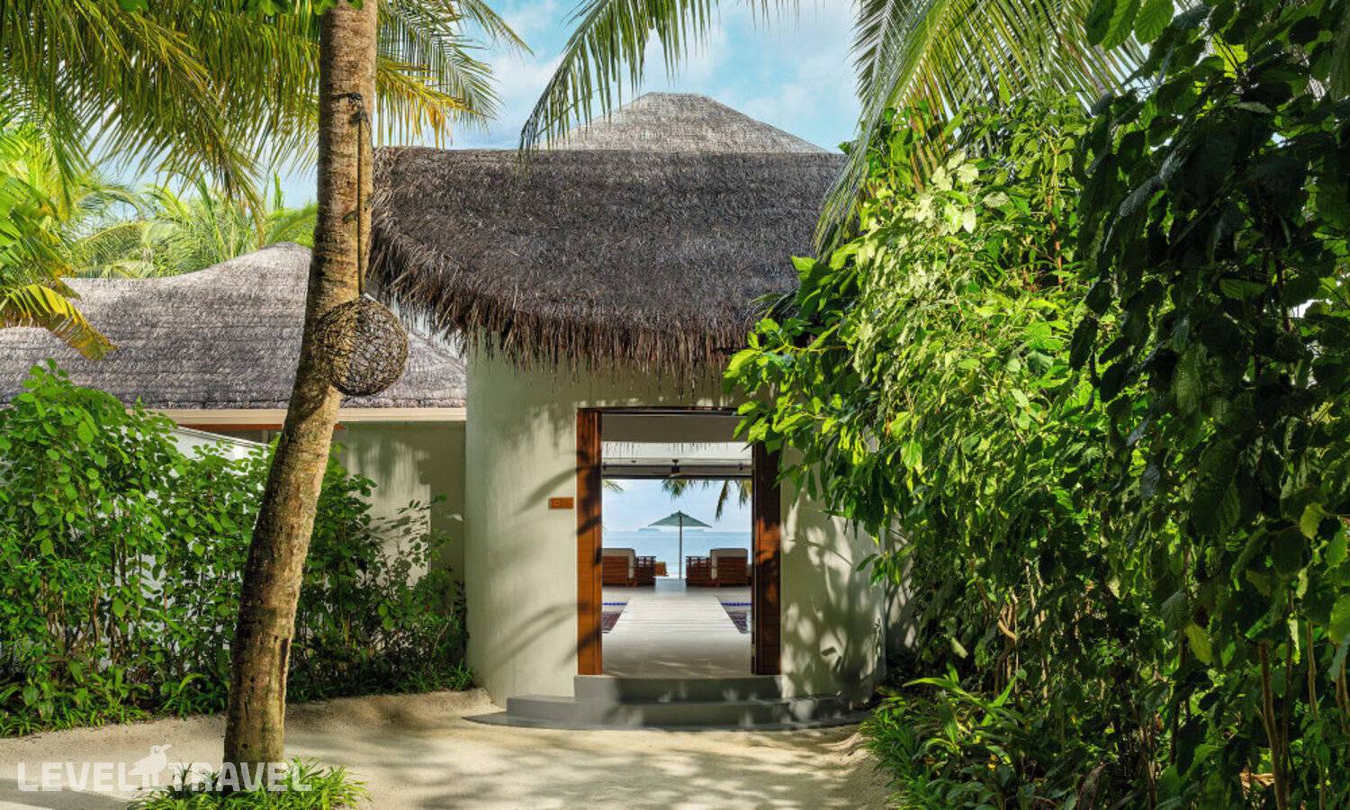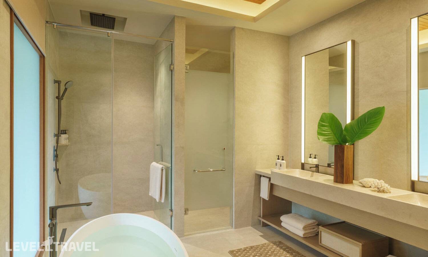 Частная двухэтажная пляжная вилла с тремя спальнями; на втором этаже спальня с двуспальной кроватью king-size, ванная комната с душем, на первом этаже две спальни с двумя односпальными кроватями queen-size, ванная комната на открытом воздухе с гидромассажной ванной и топическим душем, зона спа-процедур на открытом воздухе, отдельная столовая с обеденной зоной и гостиная, открытая терраса с бассейном, обеденной зоной и прямым выходом к пляжу