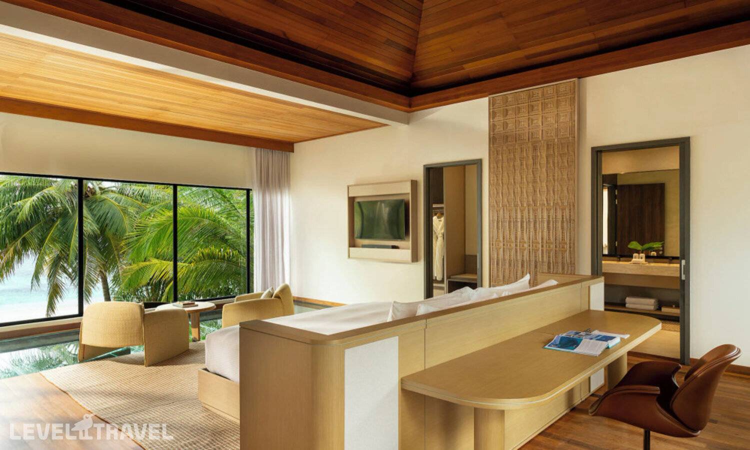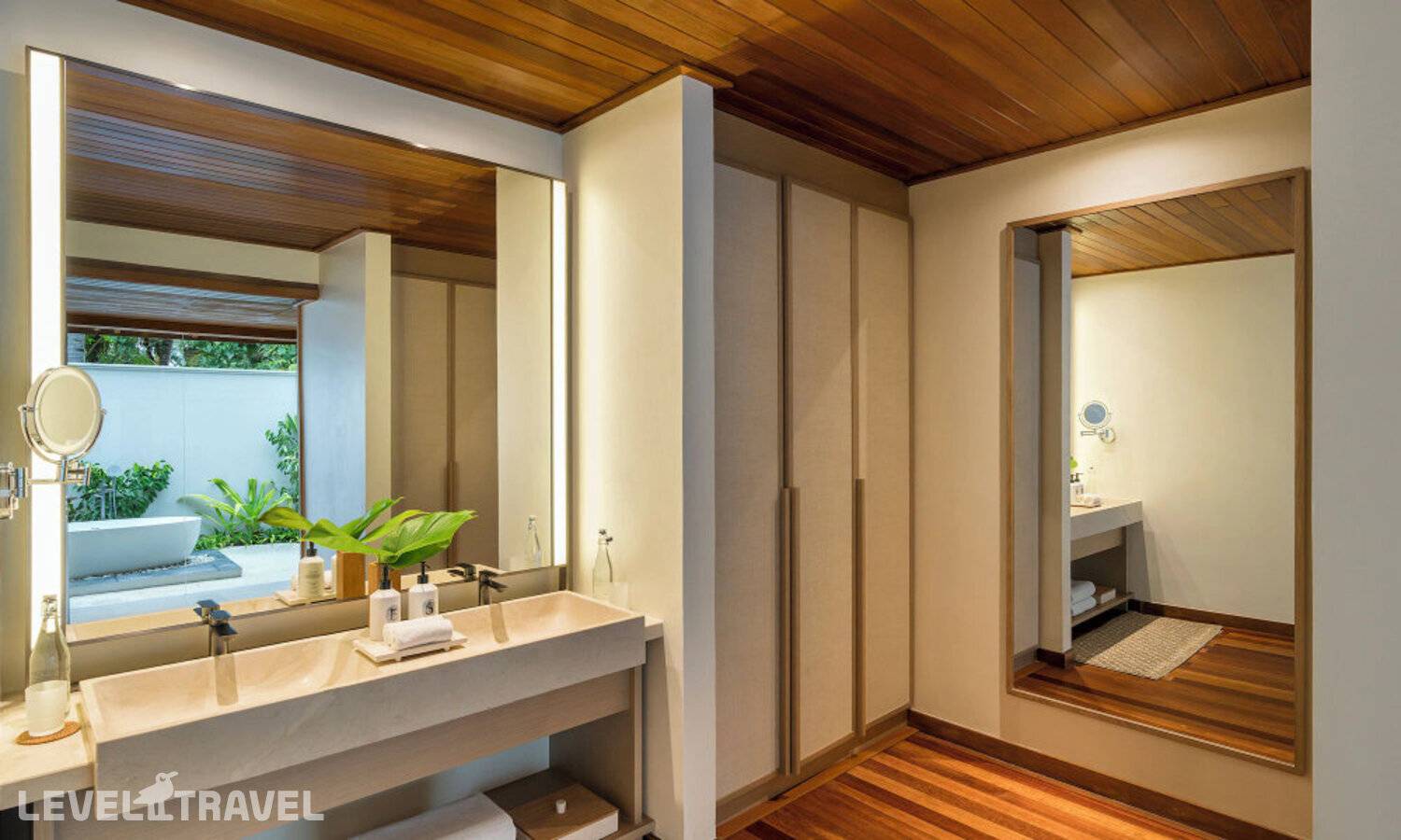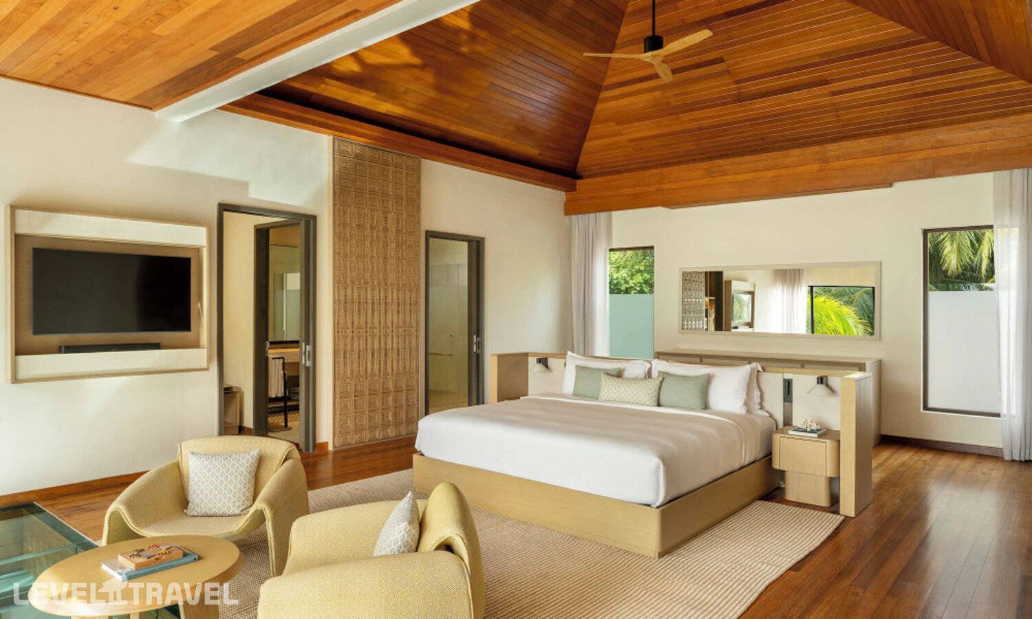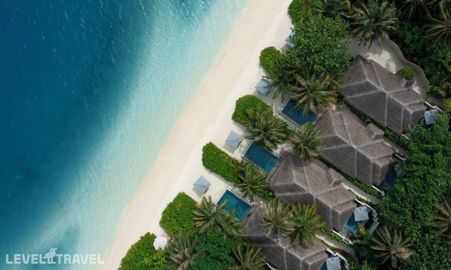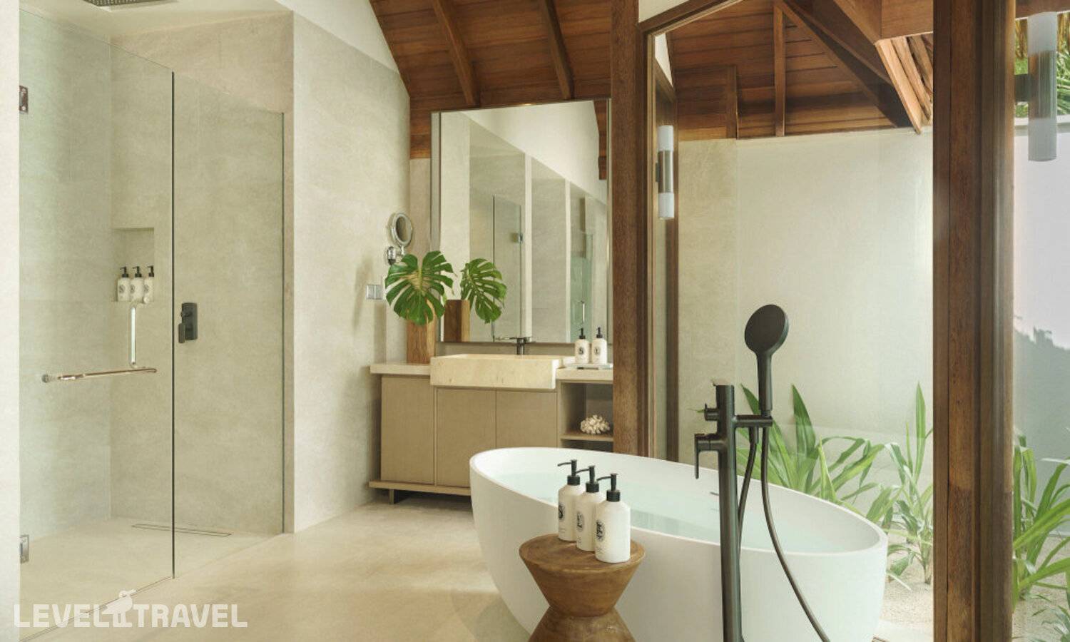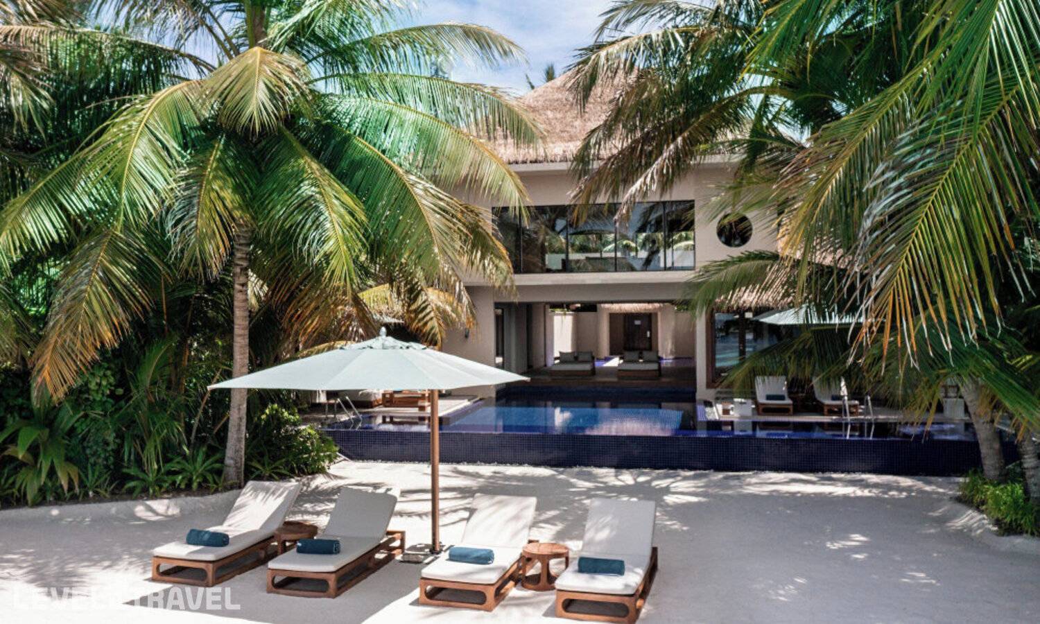 Частная двухэтажная пляжная вилла с тремя спальнями; на втором этаже спальня с двуспальной кроватью king-size, ванная комната с душем, на первом этаже две спальни с двумя односпальными кроватями queen-size, ванная комната на открытом воздухе с гидромассажной ванной и топическим душем, зона спа-процедур на открытом воздухе, отдельная столовая с обеденной зоной и гостиная, открытая терраса с бассейном, обеденной зоной и прямым выходом к пляжу
