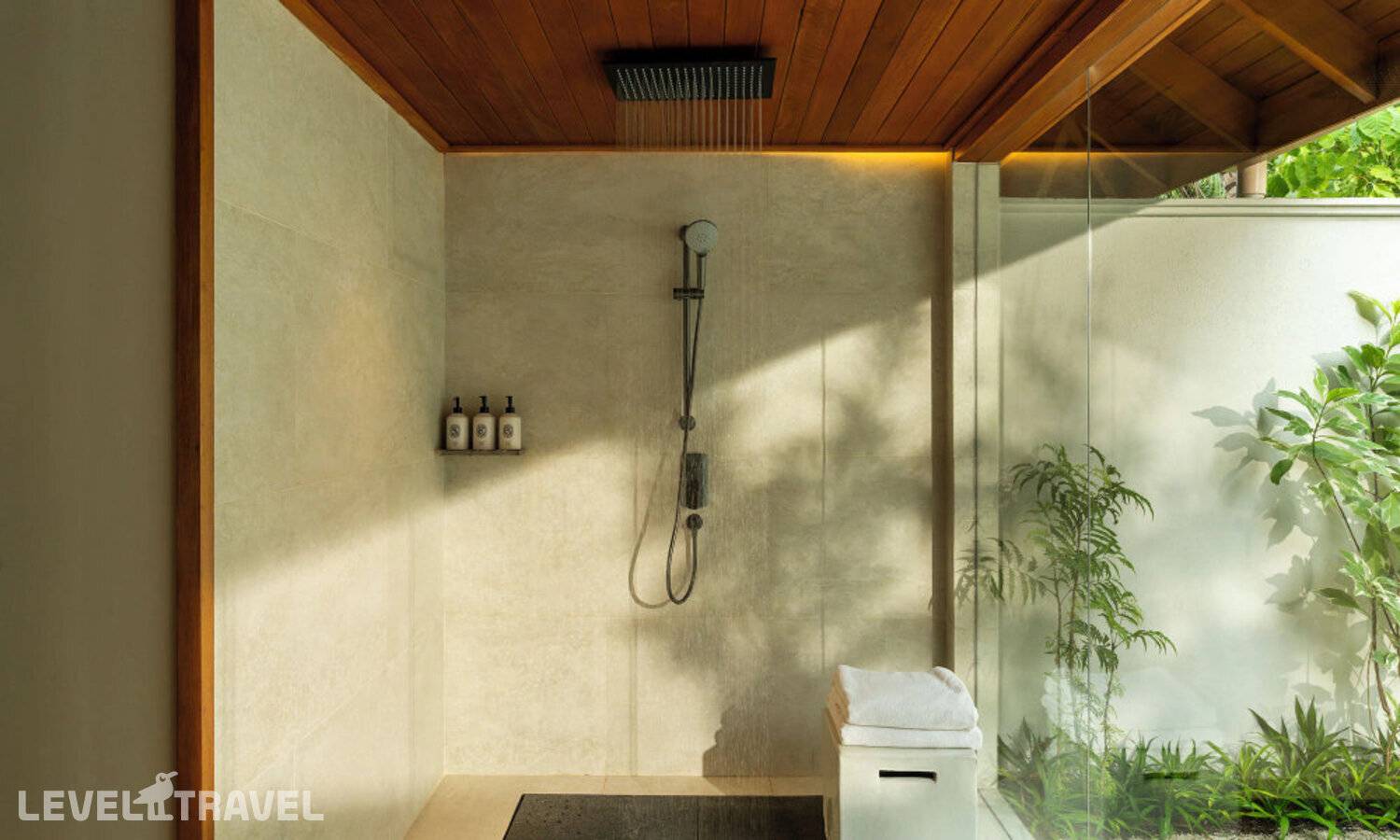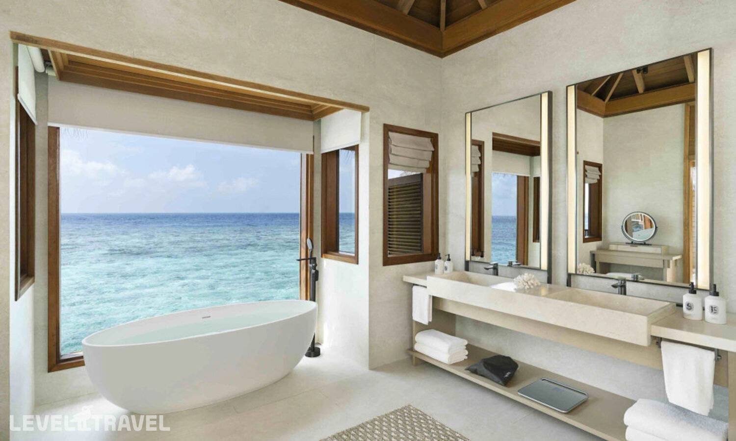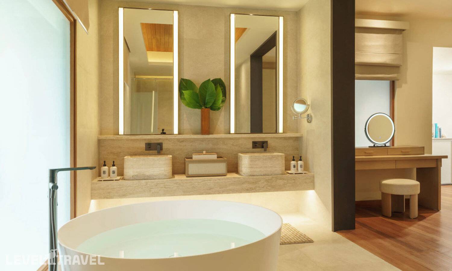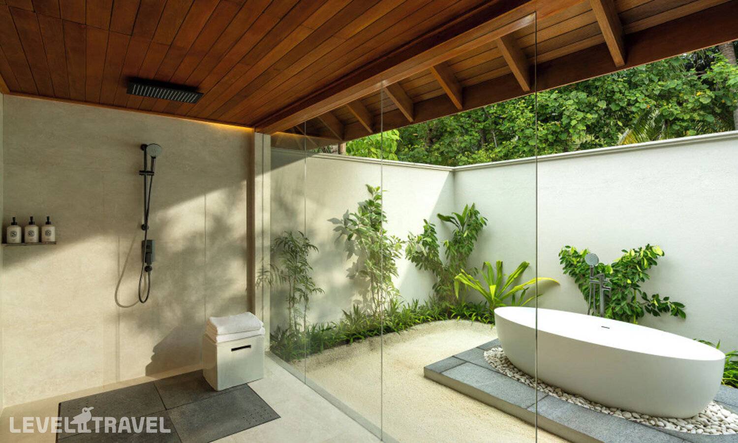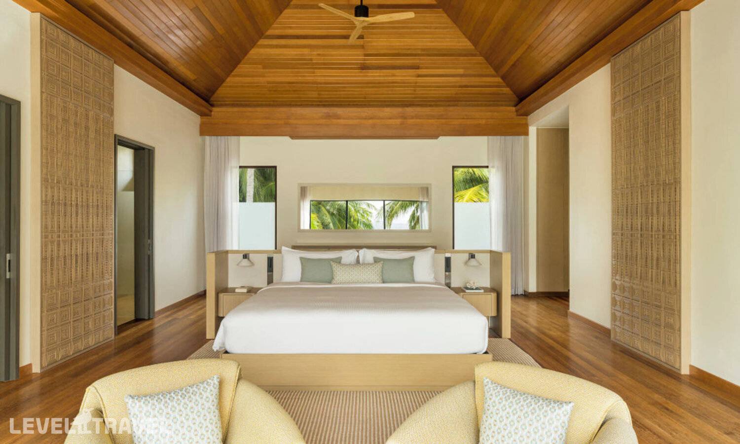 Частная двухэтажная пляжная вилла с тремя спальнями; на втором этаже спальня с двуспальной кроватью king-size, ванная комната с душем, на первом этаже две спальни с двумя односпальными кроватями queen-size, ванная комната на открытом воздухе с гидромассажной ванной и топическим душем, зона спа-процедур на открытом воздухе, отдельная столовая с обеденной зоной и гостиная, открытая терраса с бассейном, обеденной зоной и прямым выходом к пляжу