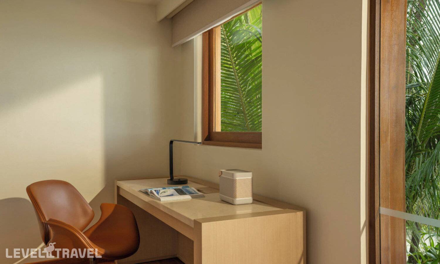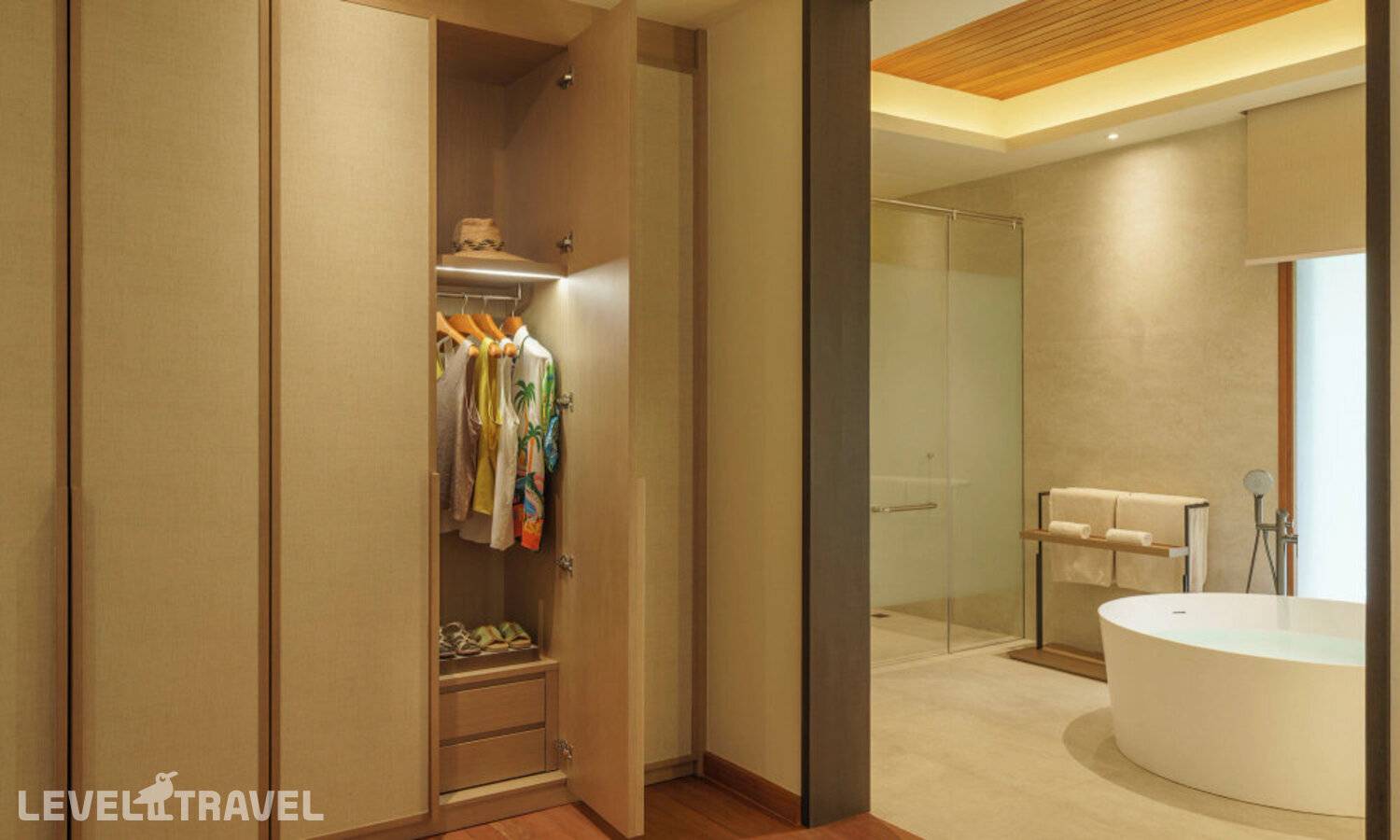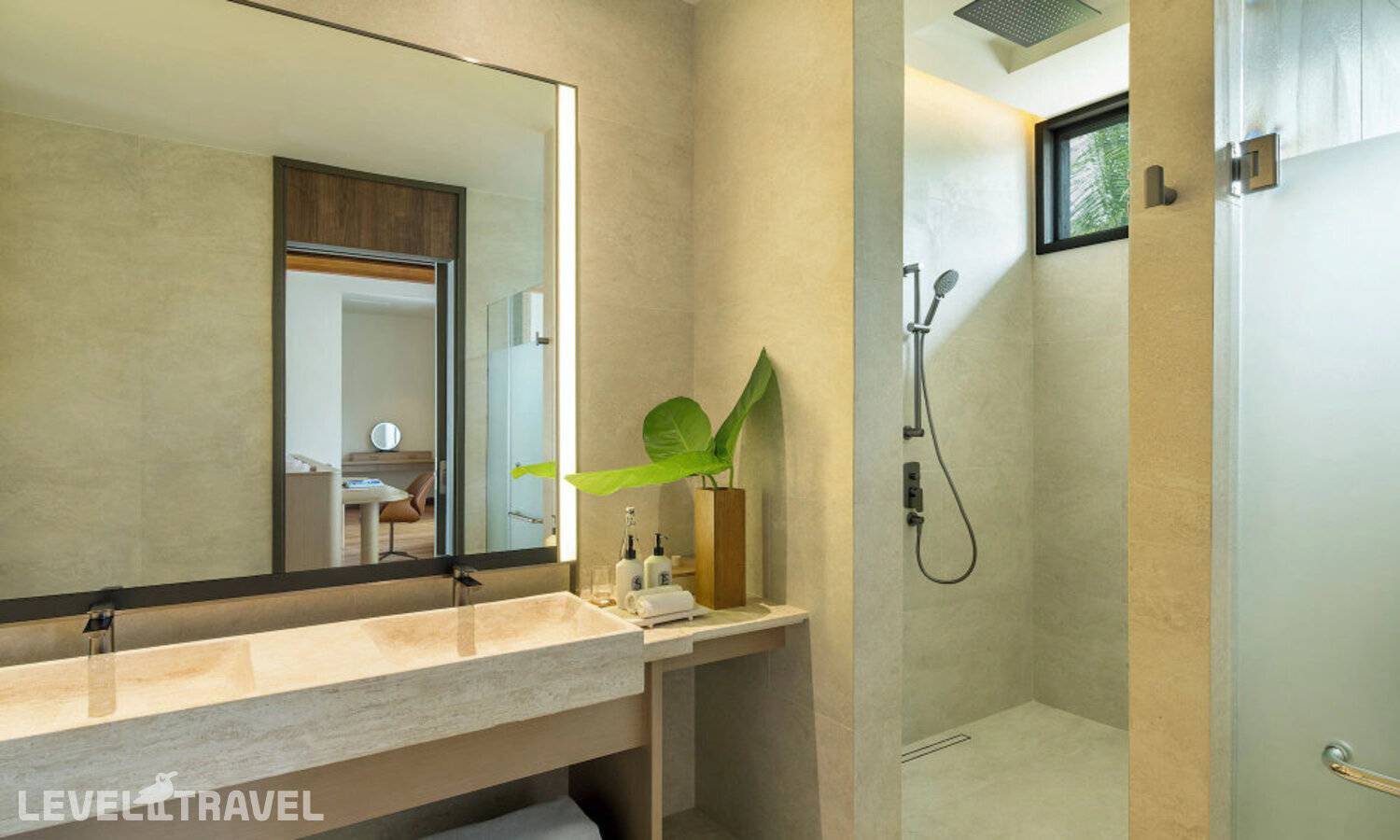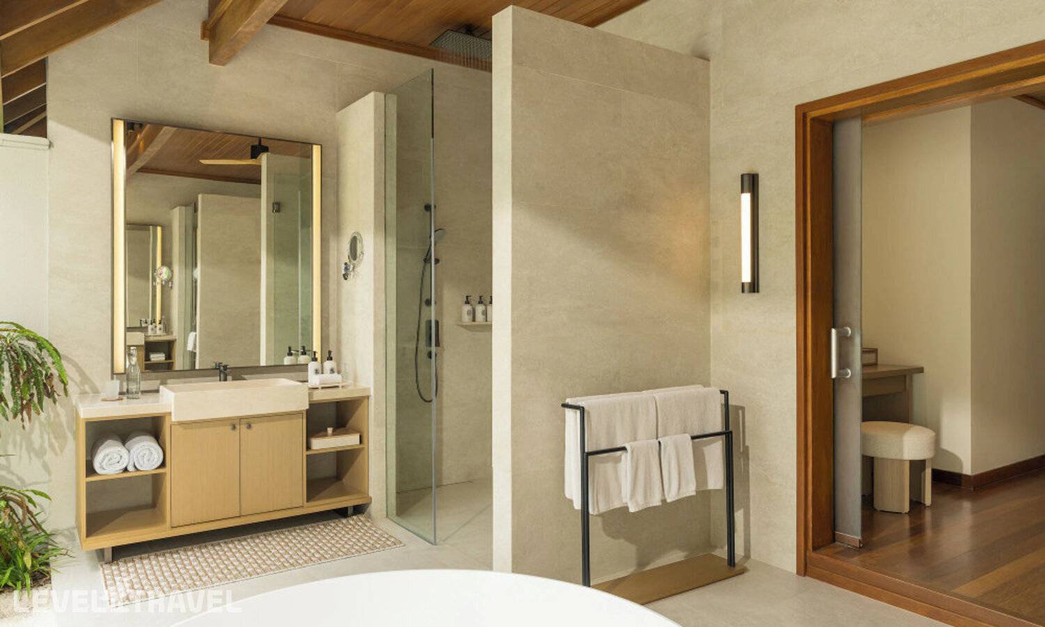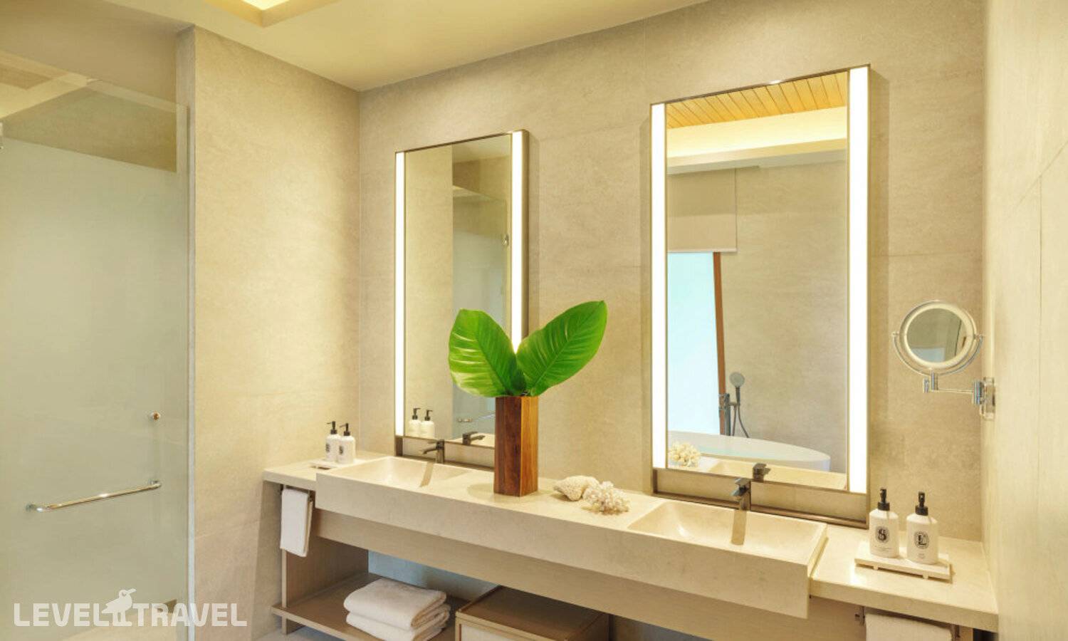 Частная двухэтажная пляжная вилла с тремя спальнями; на втором этаже спальня с двуспальной кроватью king-size, ванная комната с душем, на первом этаже две спальни с двумя односпальными кроватями queen-size, ванная комната на открытом воздухе с гидромассажной ванной и топическим душем, зона спа-процедур на открытом воздухе, отдельная столовая с обеденной зоной и гостиная, открытая терраса с бассейном, обеденной зоной и прямым выходом к пляжу