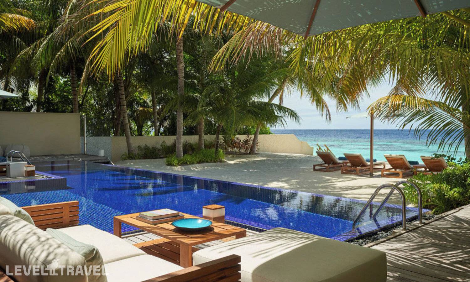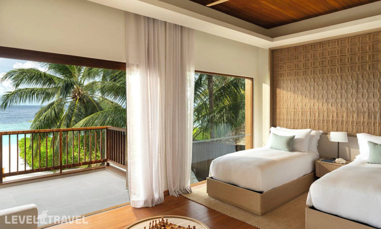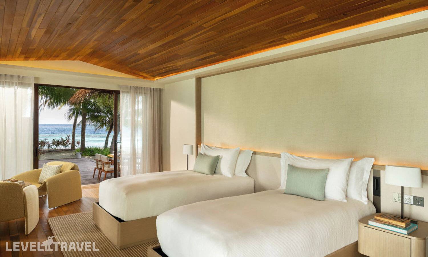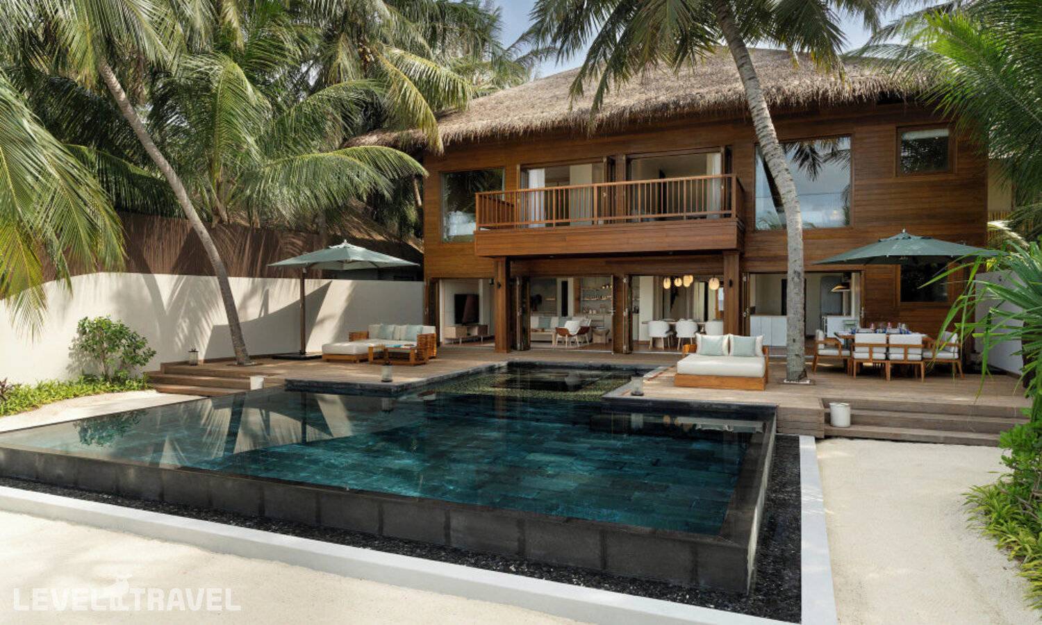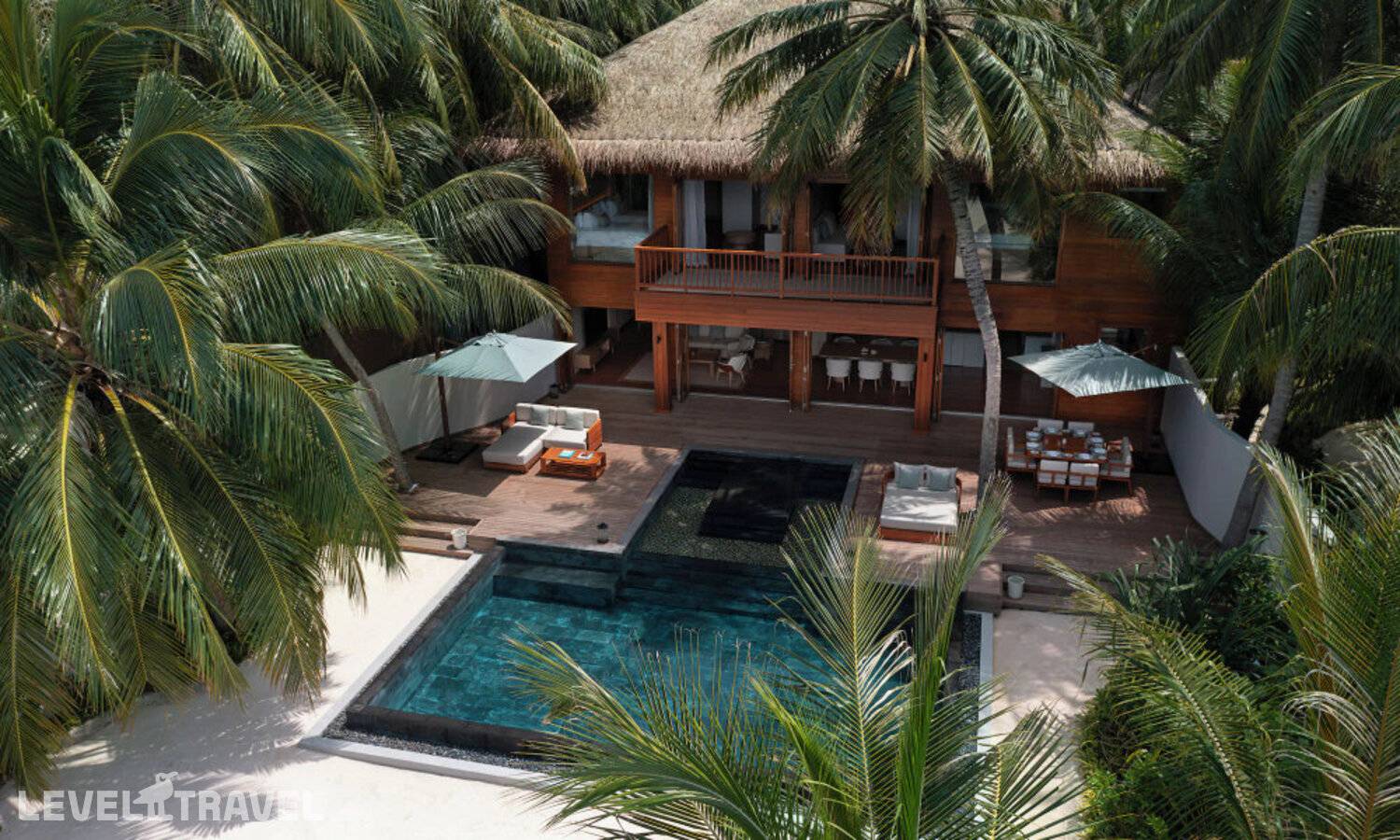 Частная двухэтажная пляжная вилла с двумя спальнями; на втором этаже спальня с двуспальной кроватью king-size, ванная комната с душем, на первом этаже вторая спальня с двумя односпальными кроватями queen-size, ванная комната на открытом воздухе с гидромассажной ванной и топическим душем, зона спа-процедур на открытом воздухе, отдельная столовая с обеденной зоной, гостиная, открытая терраса с бассейном, обеденной зоной и прямым выходом к пляжу