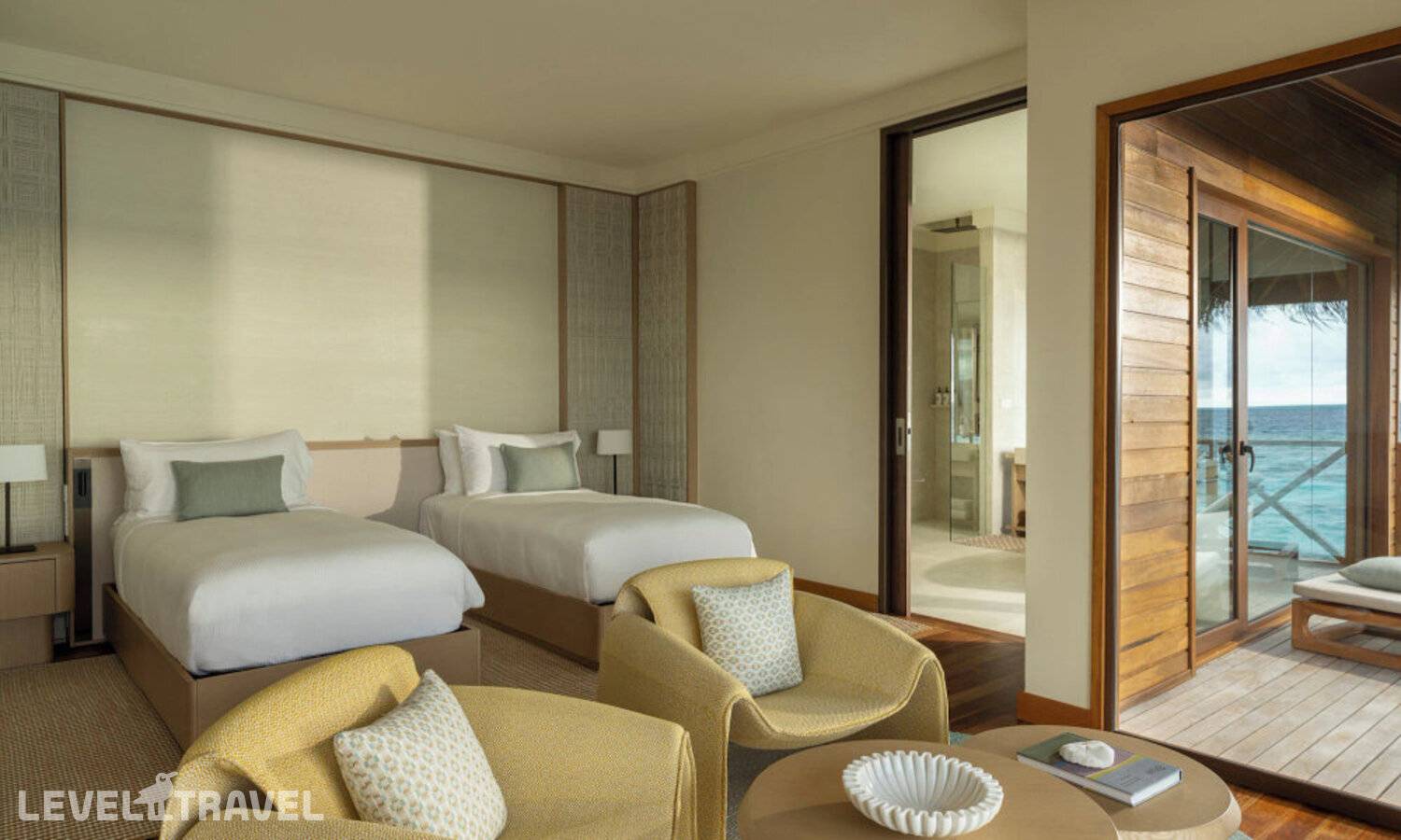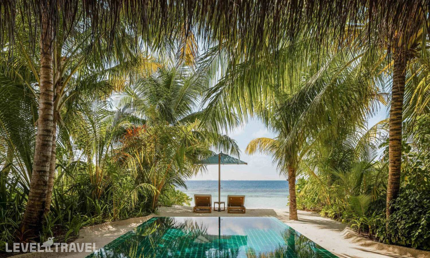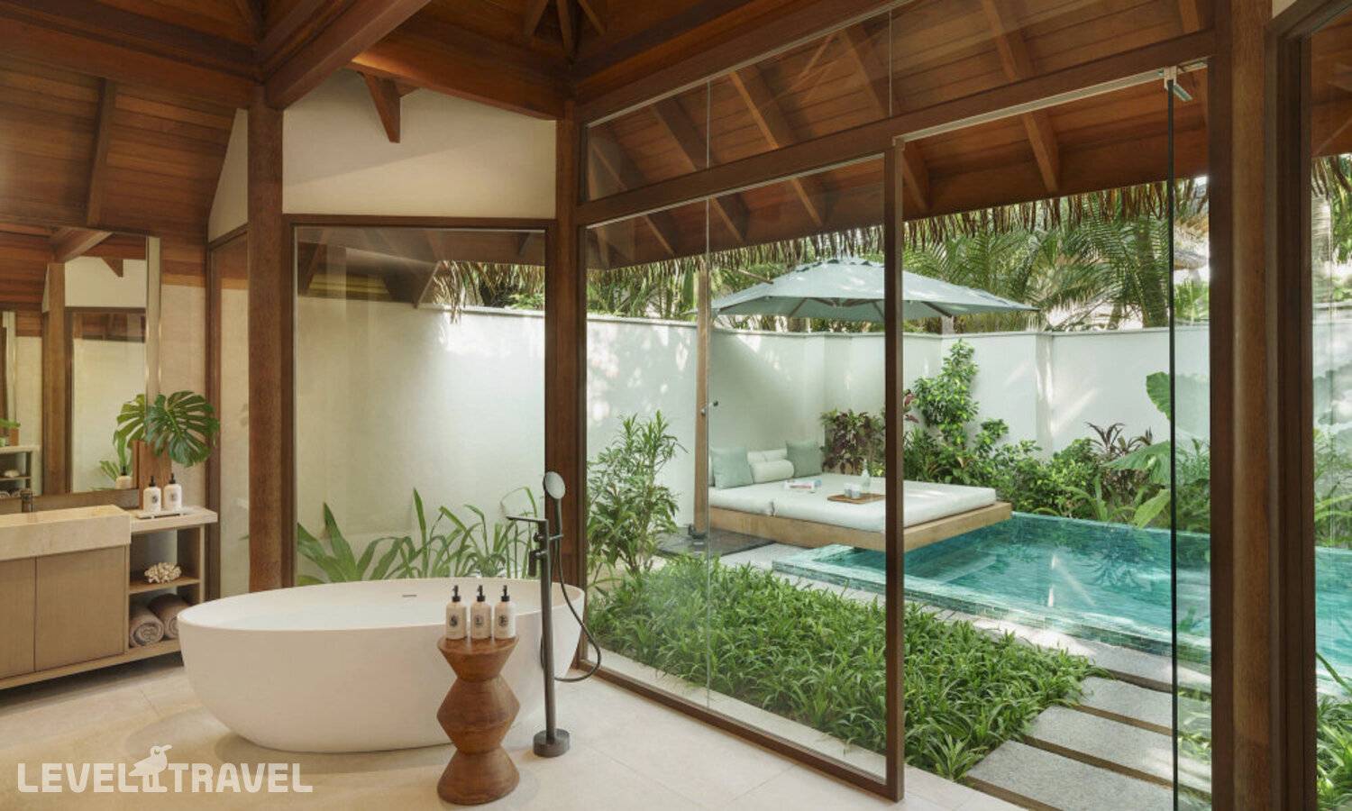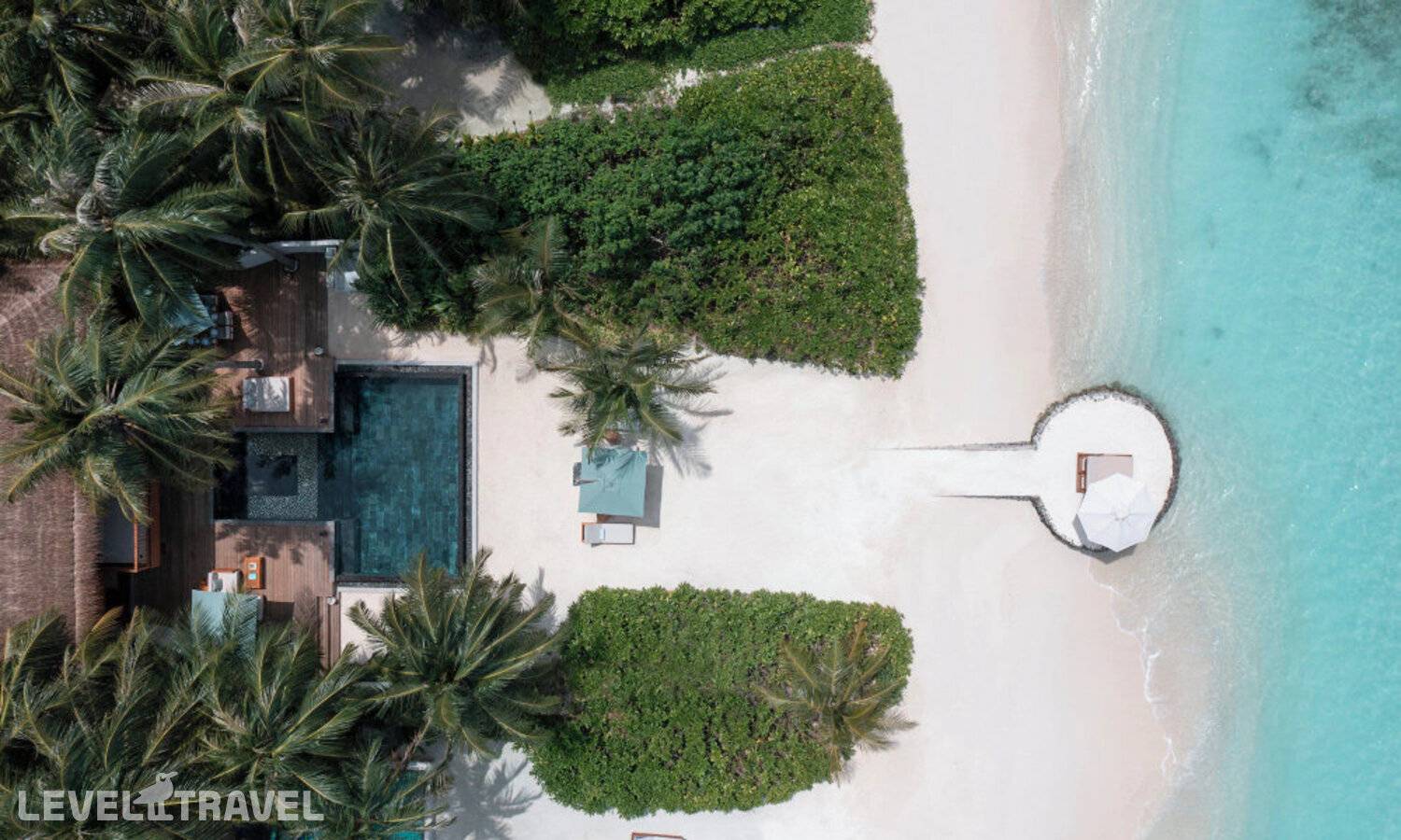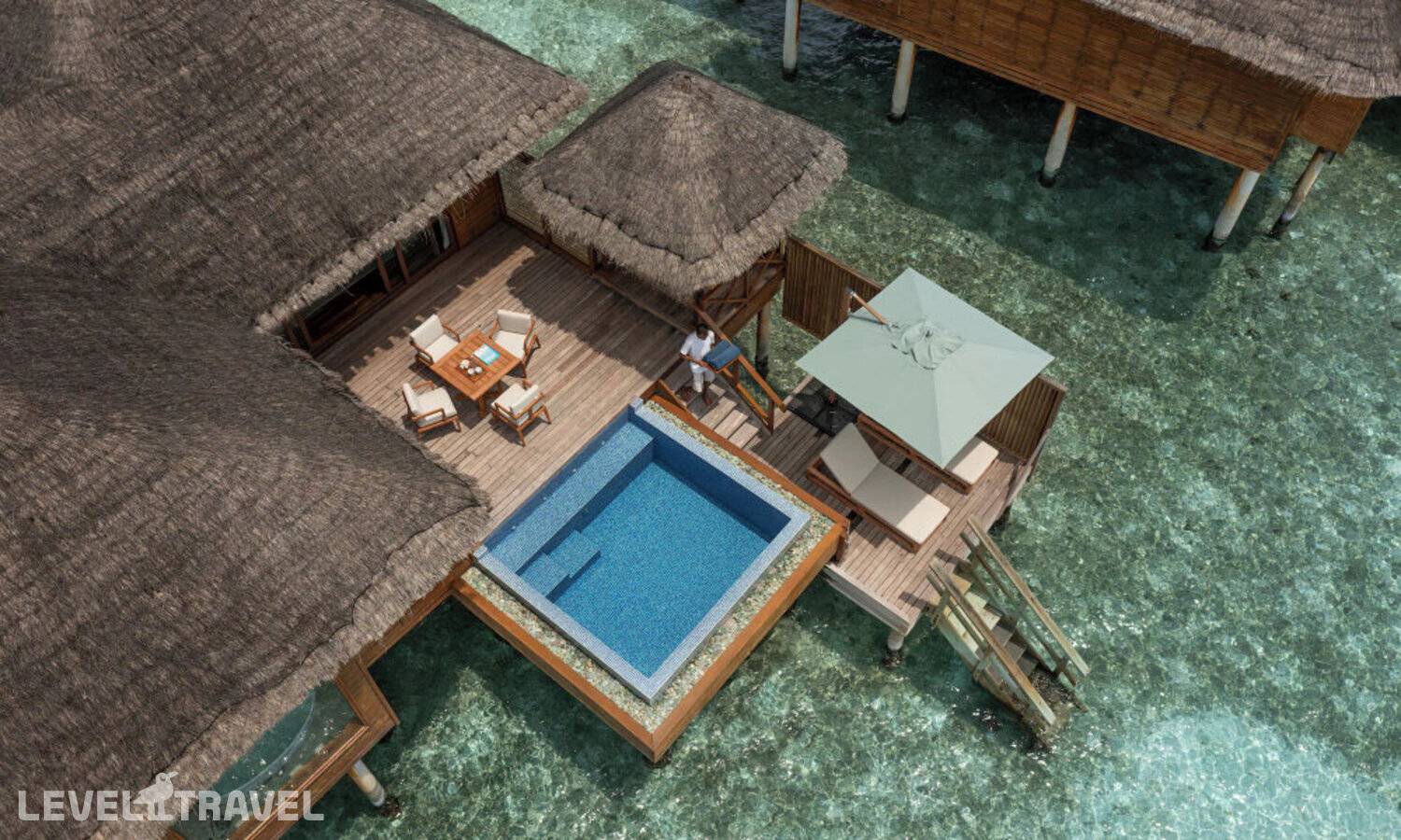 Частная двухэтажная пляжная вилла с двумя спальнями; на втором этаже спальня с двуспальной кроватью king-size, ванная комната с душем, на первом этаже вторая спальня с двумя односпальными кроватями queen-size, ванная комната на открытом воздухе с гидромассажной ванной и топическим душем, зона спа-процедур на открытом воздухе, отдельная столовая с обеденной зоной, гостиная, открытая терраса с бассейном, обеденной зоной и прямым выходом к пляжу