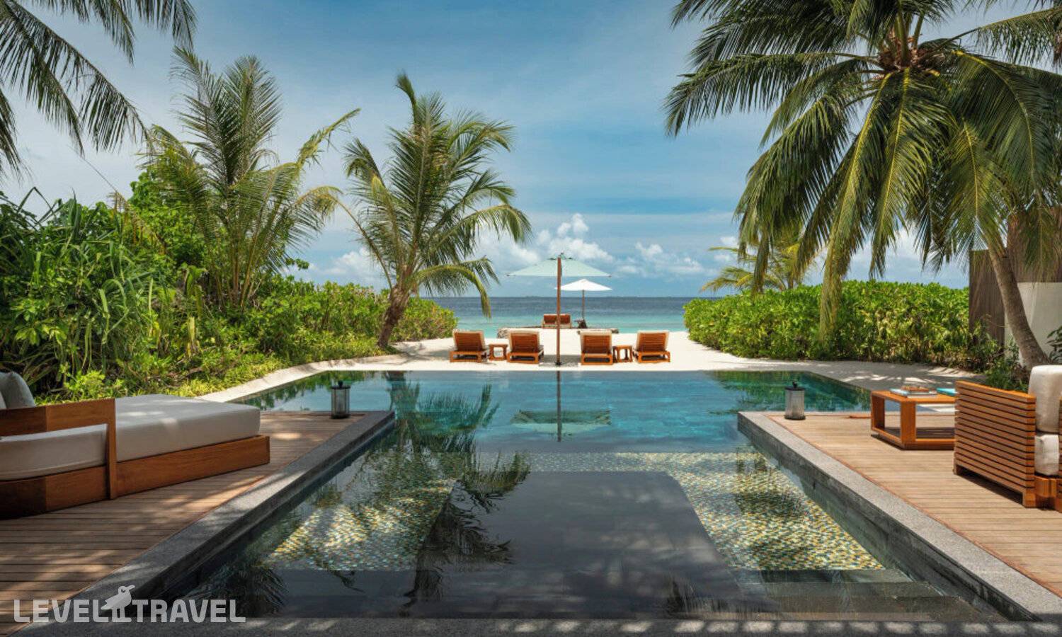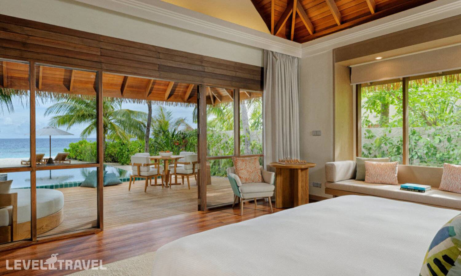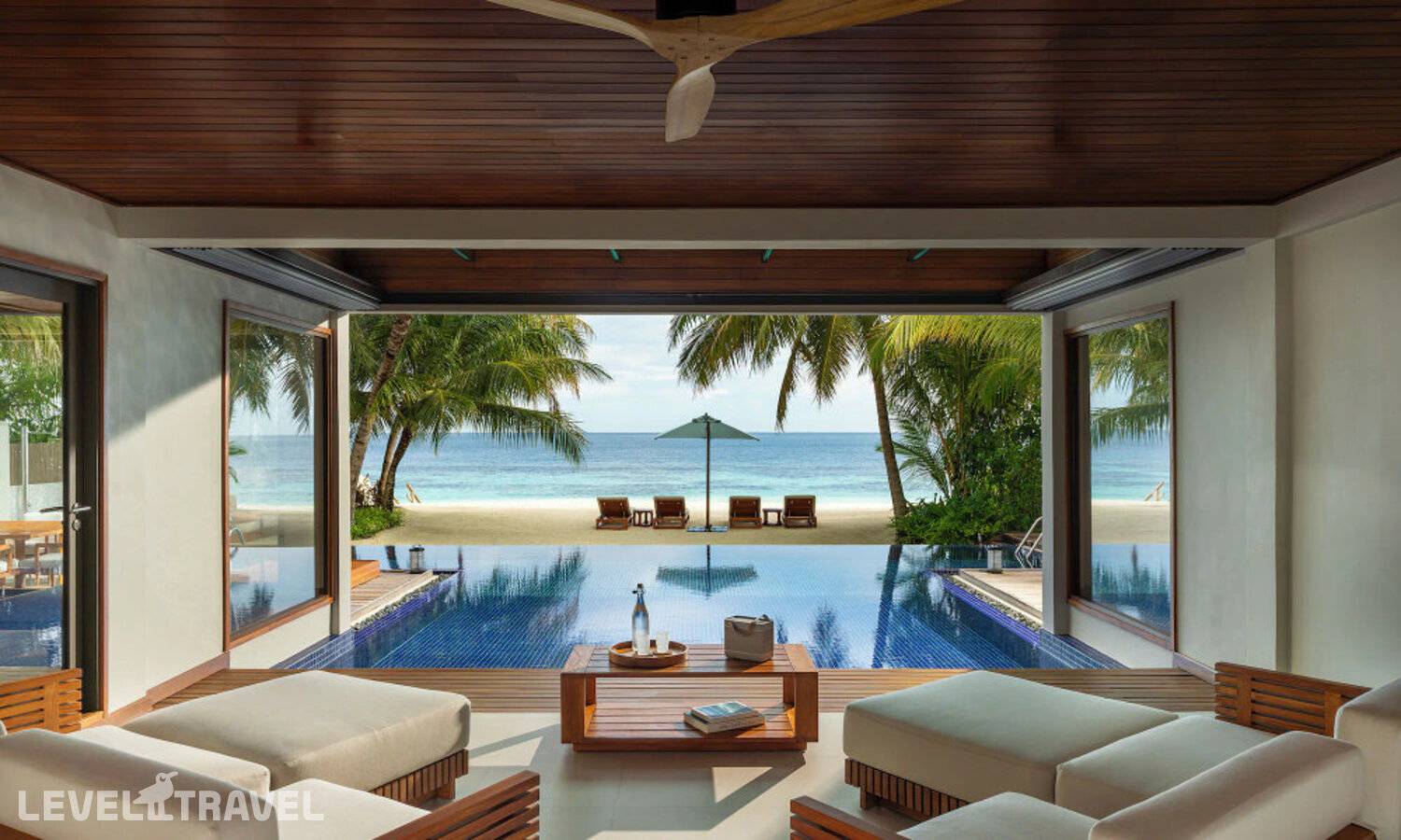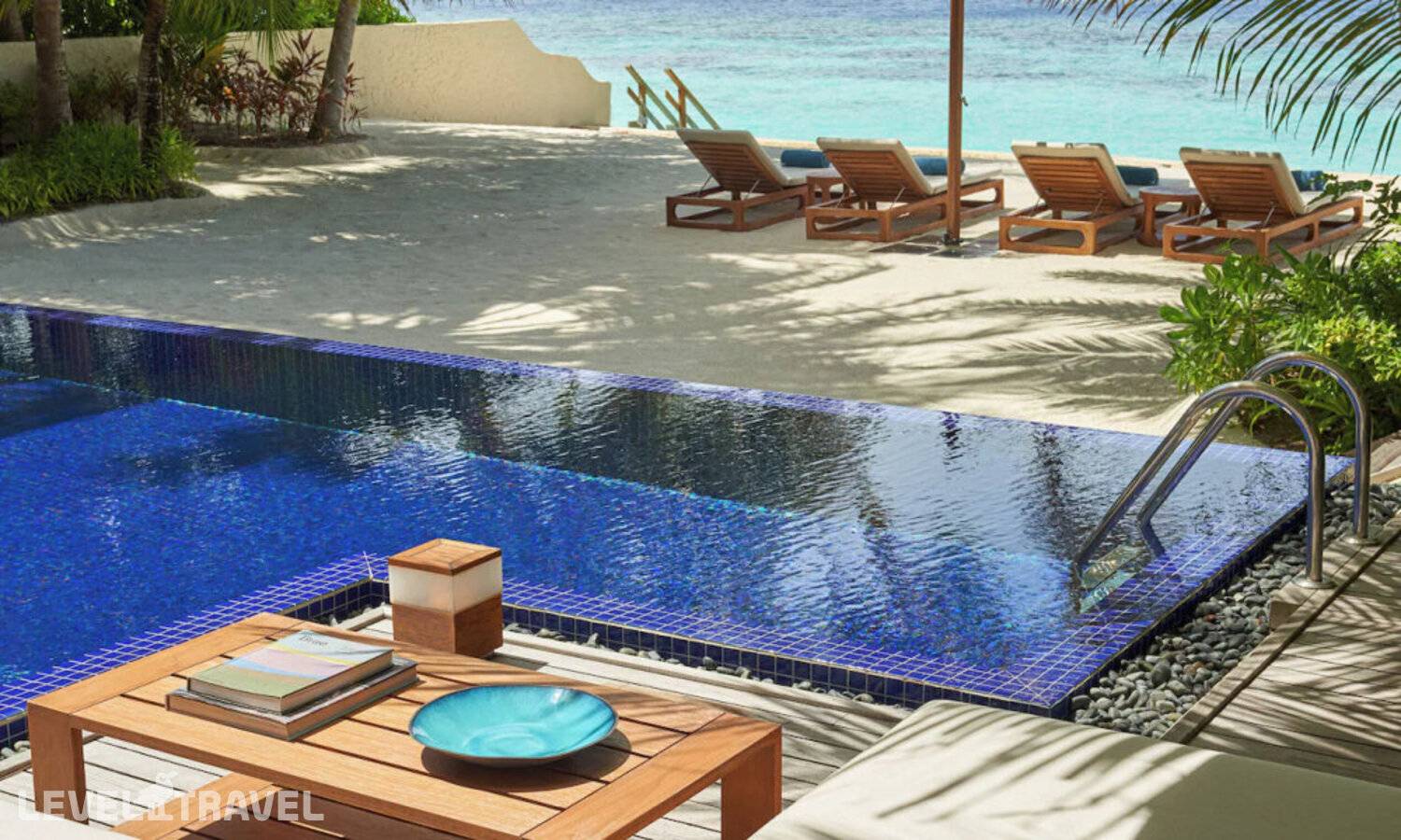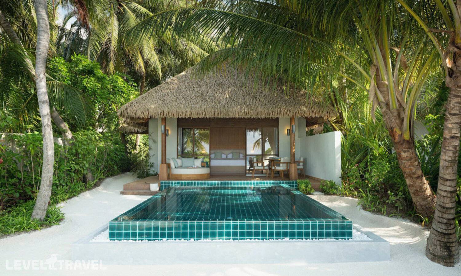 Частная двухэтажная пляжная вилла с двумя спальнями; на втором этаже спальня с двуспальной кроватью king-size, ванная комната с душем, на первом этаже вторая спальня с двумя односпальными кроватями queen-size, ванная комната на открытом воздухе с гидромассажной ванной и топическим душем, зона спа-процедур на открытом воздухе, отдельная столовая с обеденной зоной, гостиная, открытая терраса с бассейном, обеденной зоной и прямым выходом к пляжу
