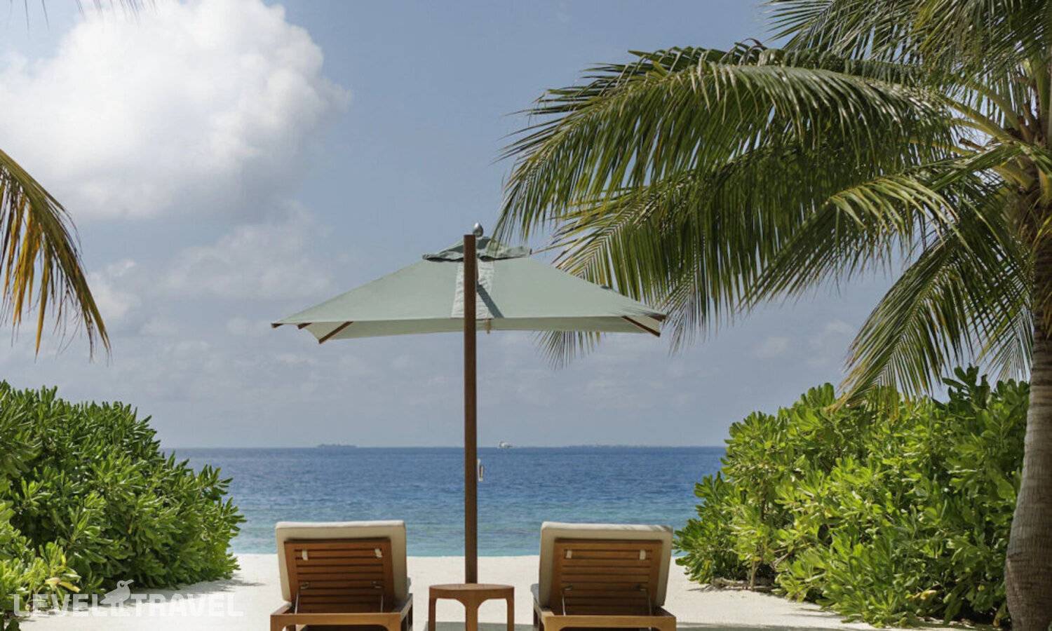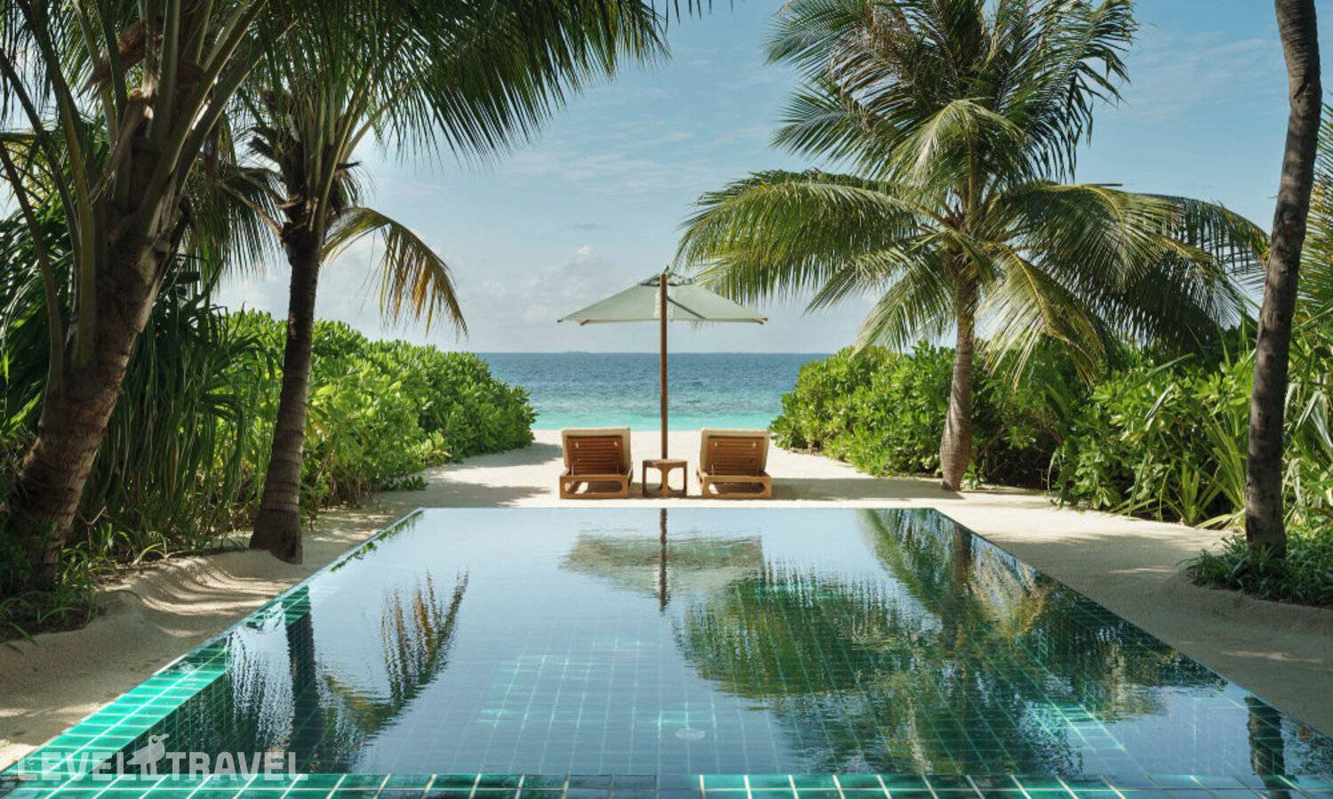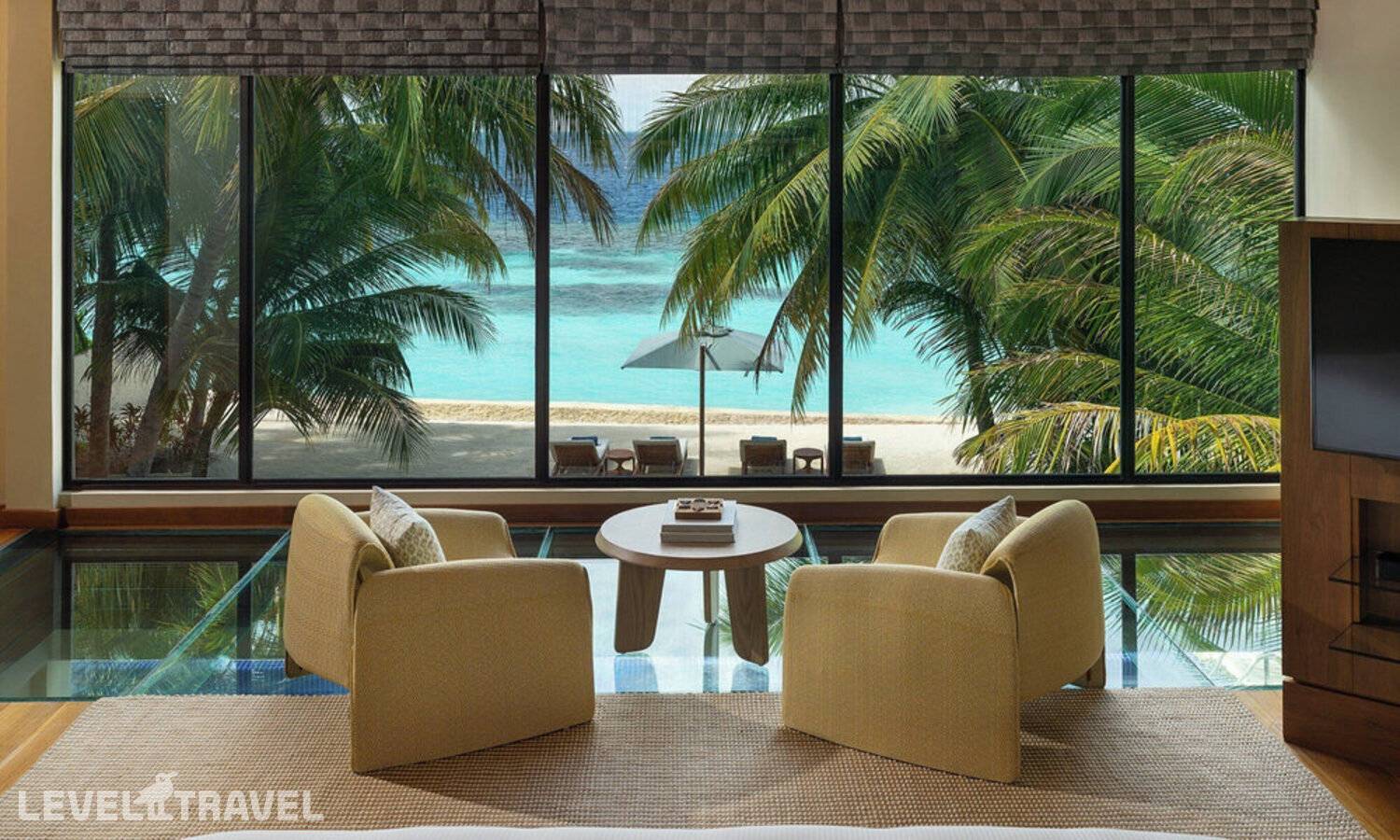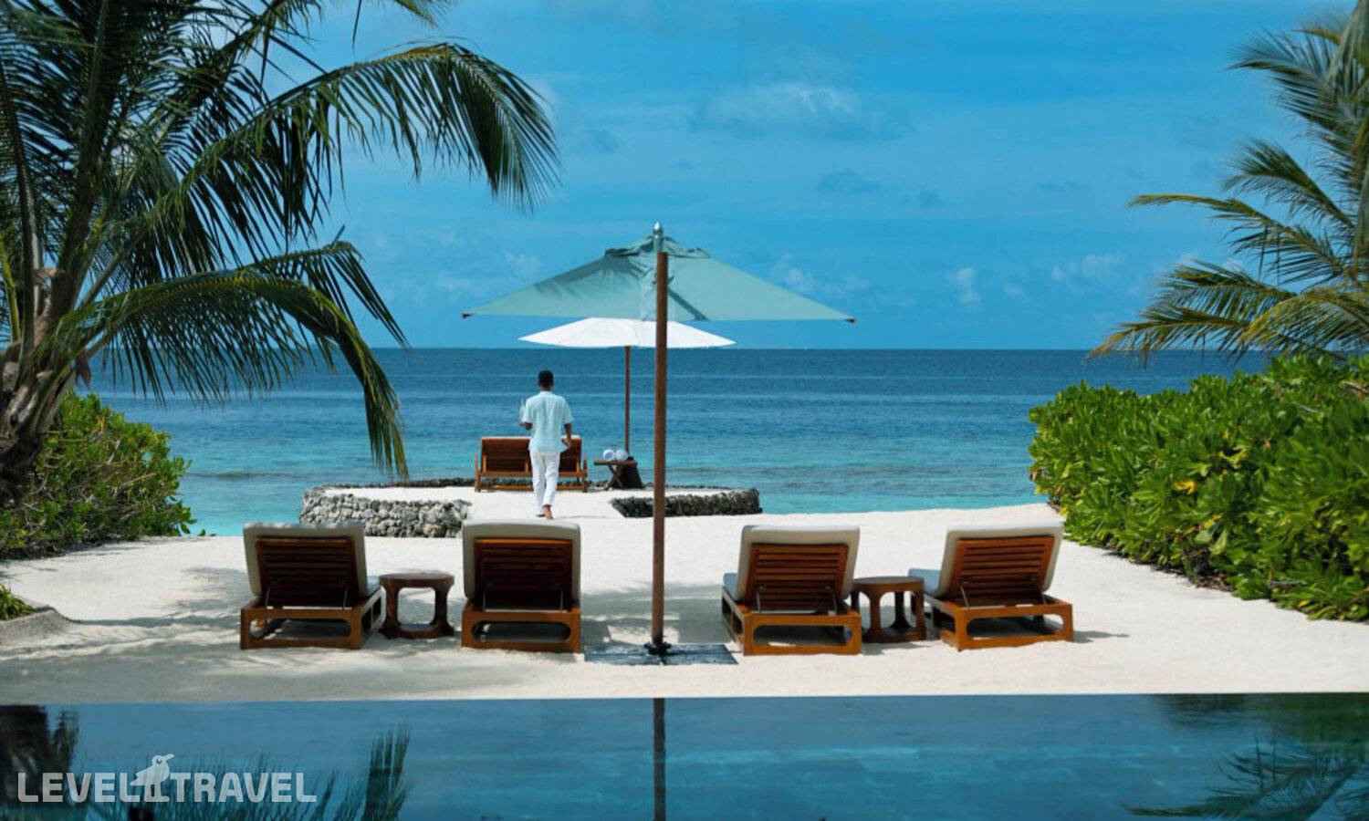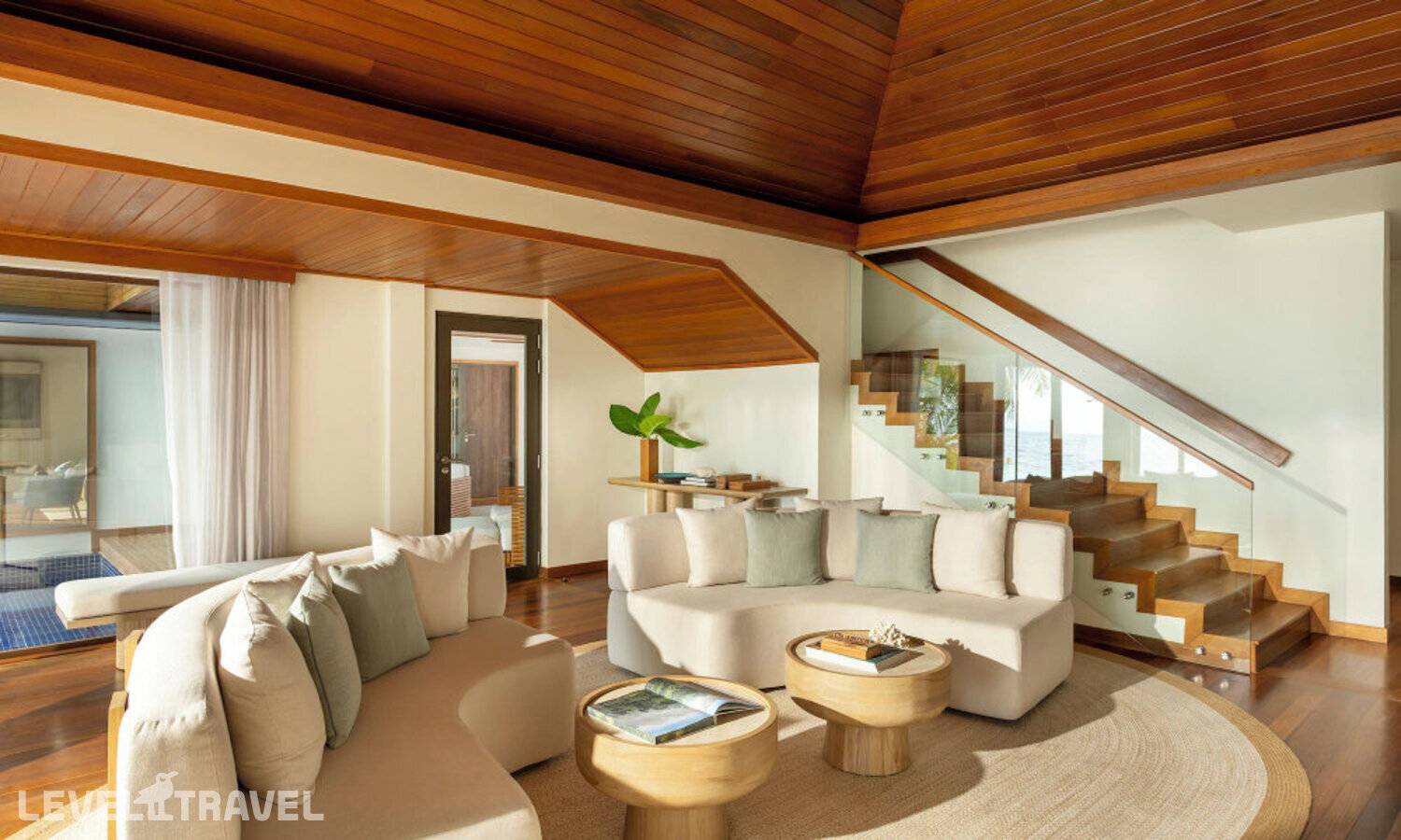 Частная двухэтажная пляжная вилла с двумя спальнями; на втором этаже спальня с двуспальной кроватью king-size, ванная комната с душем, на первом этаже вторая спальня с двумя односпальными кроватями queen-size, ванная комната на открытом воздухе с гидромассажной ванной и топическим душем, зона спа-процедур на открытом воздухе, отдельная столовая с обеденной зоной, гостиная, открытая терраса с бассейном, обеденной зоной и прямым выходом к пляжу