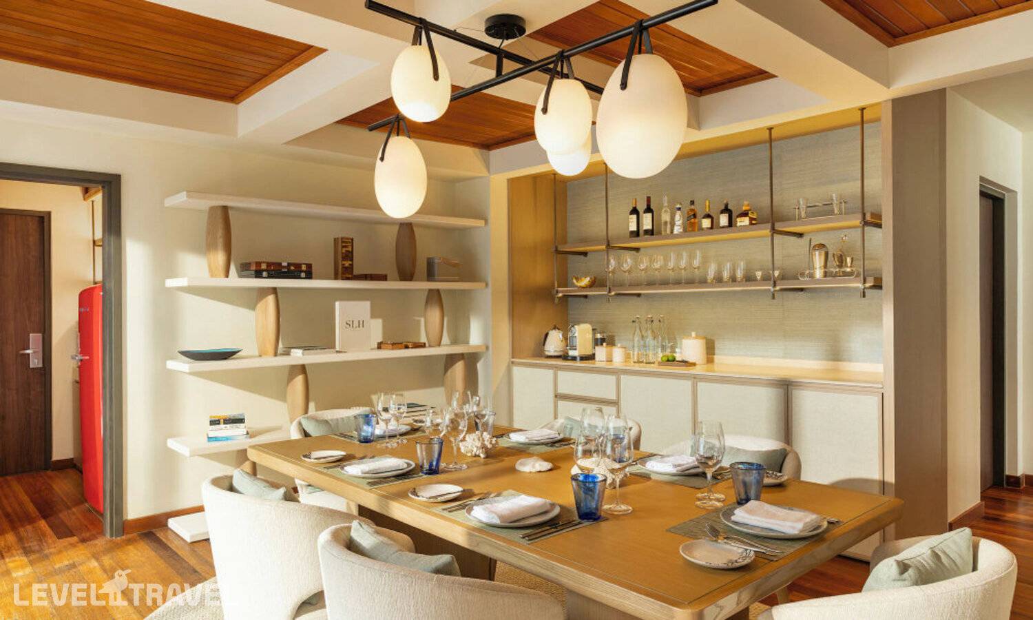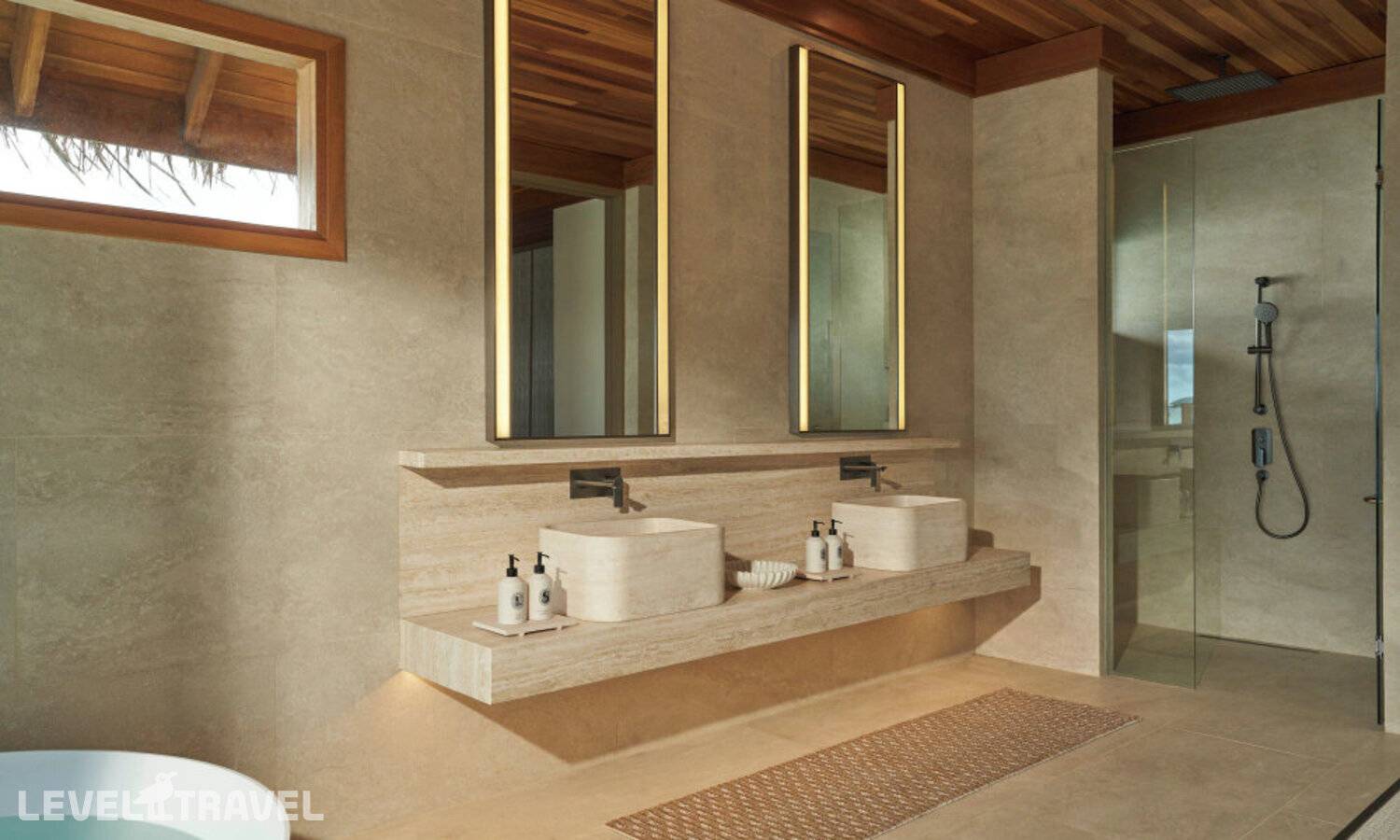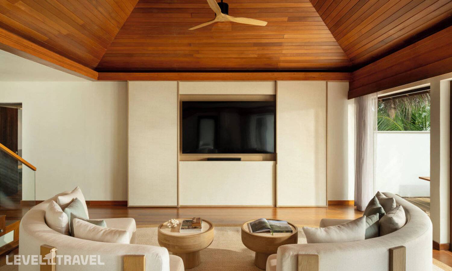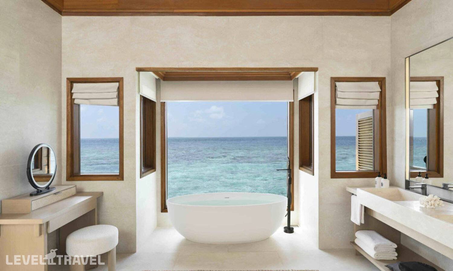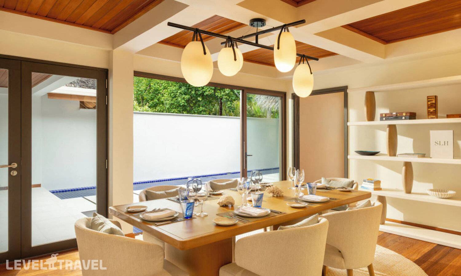 Частная двухэтажная пляжная вилла с двумя спальнями; на втором этаже спальня с двуспальной кроватью king-size, ванная комната с душем, на первом этаже вторая спальня с двумя односпальными кроватями queen-size, ванная комната на открытом воздухе с гидромассажной ванной и топическим душем, зона спа-процедур на открытом воздухе, отдельная столовая с обеденной зоной, гостиная, открытая терраса с бассейном, обеденной зоной и прямым выходом к пляжу