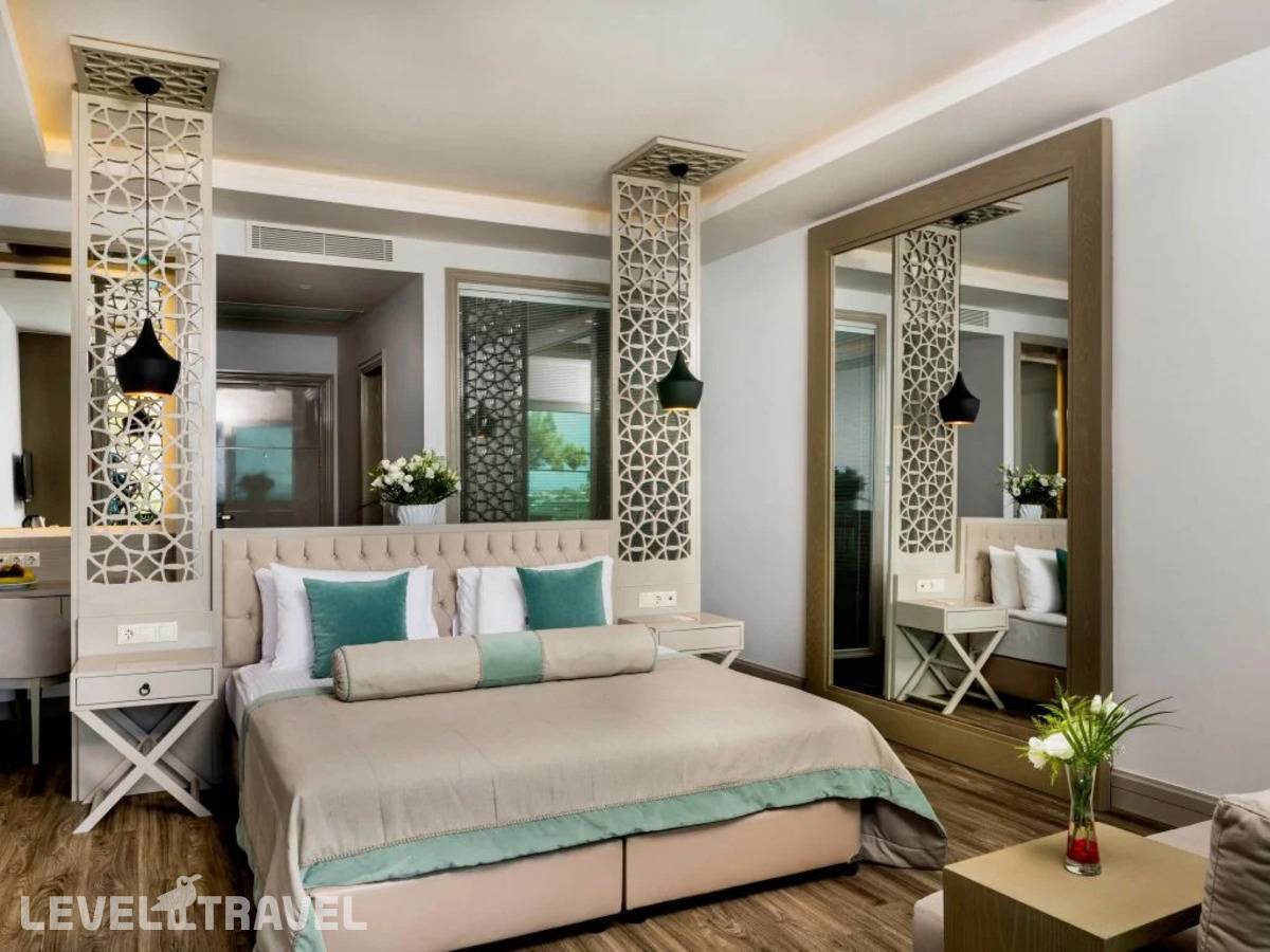 Стильный номер, состоящий из гостиной и спальни. В номере двуспальная или две односпальные кровати. Вид на море.