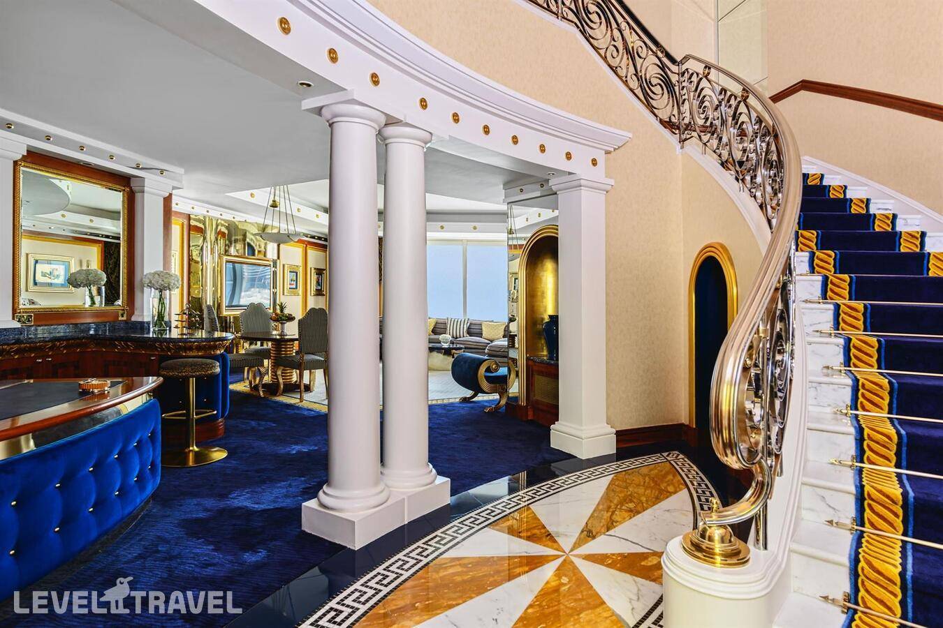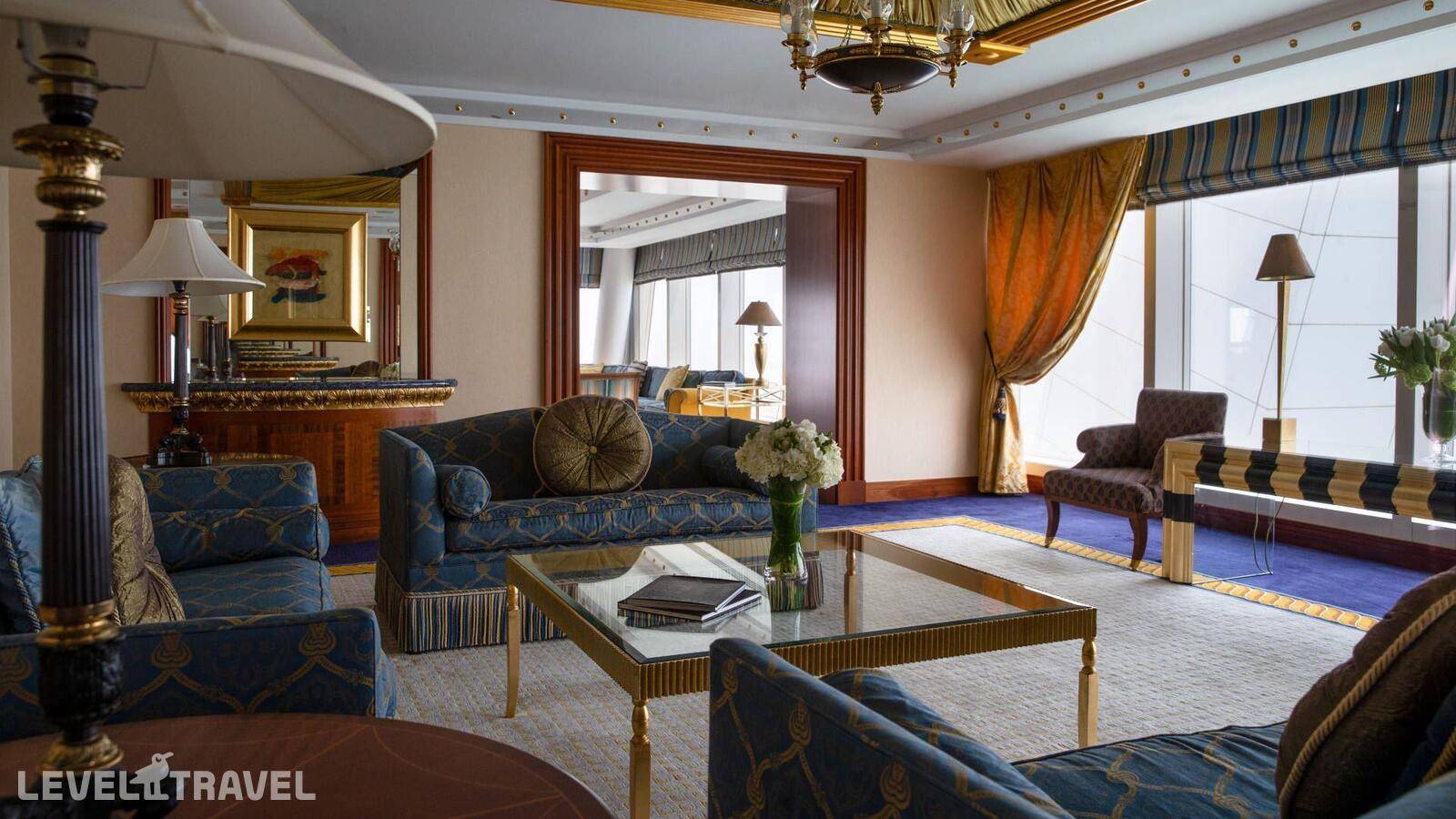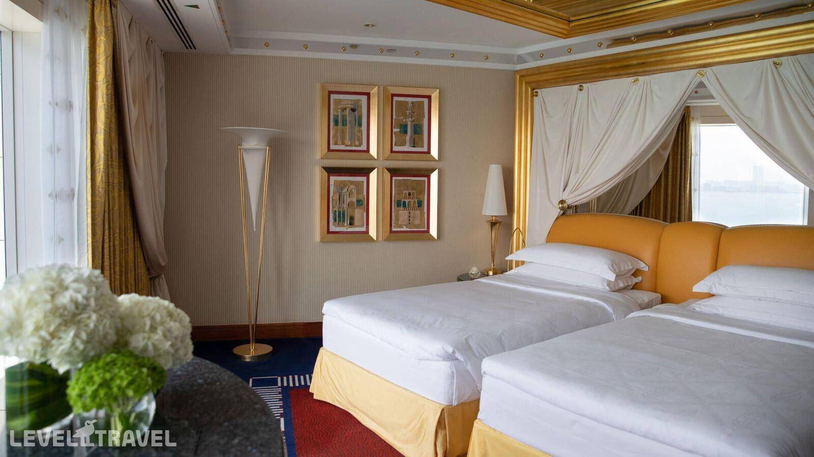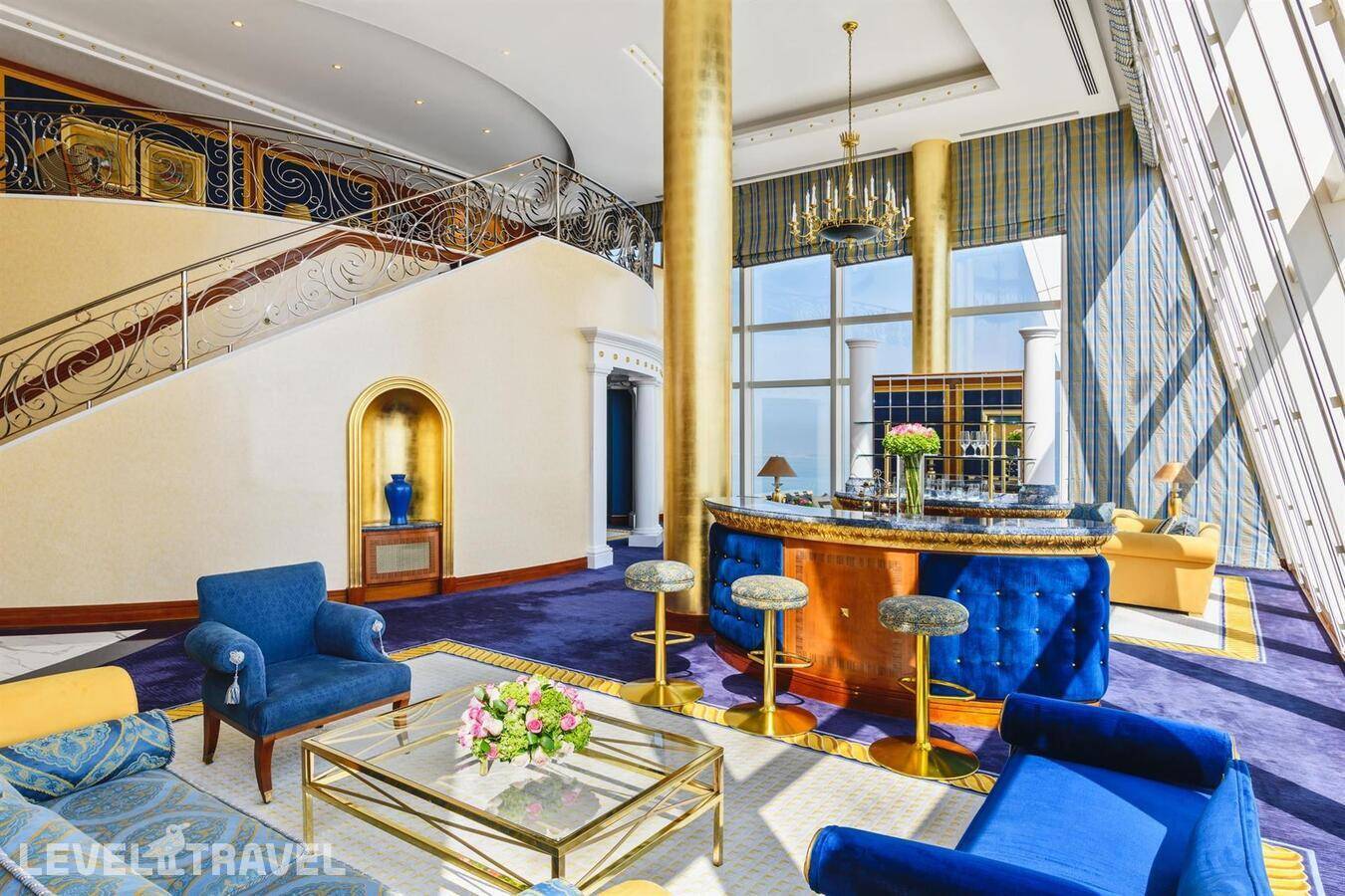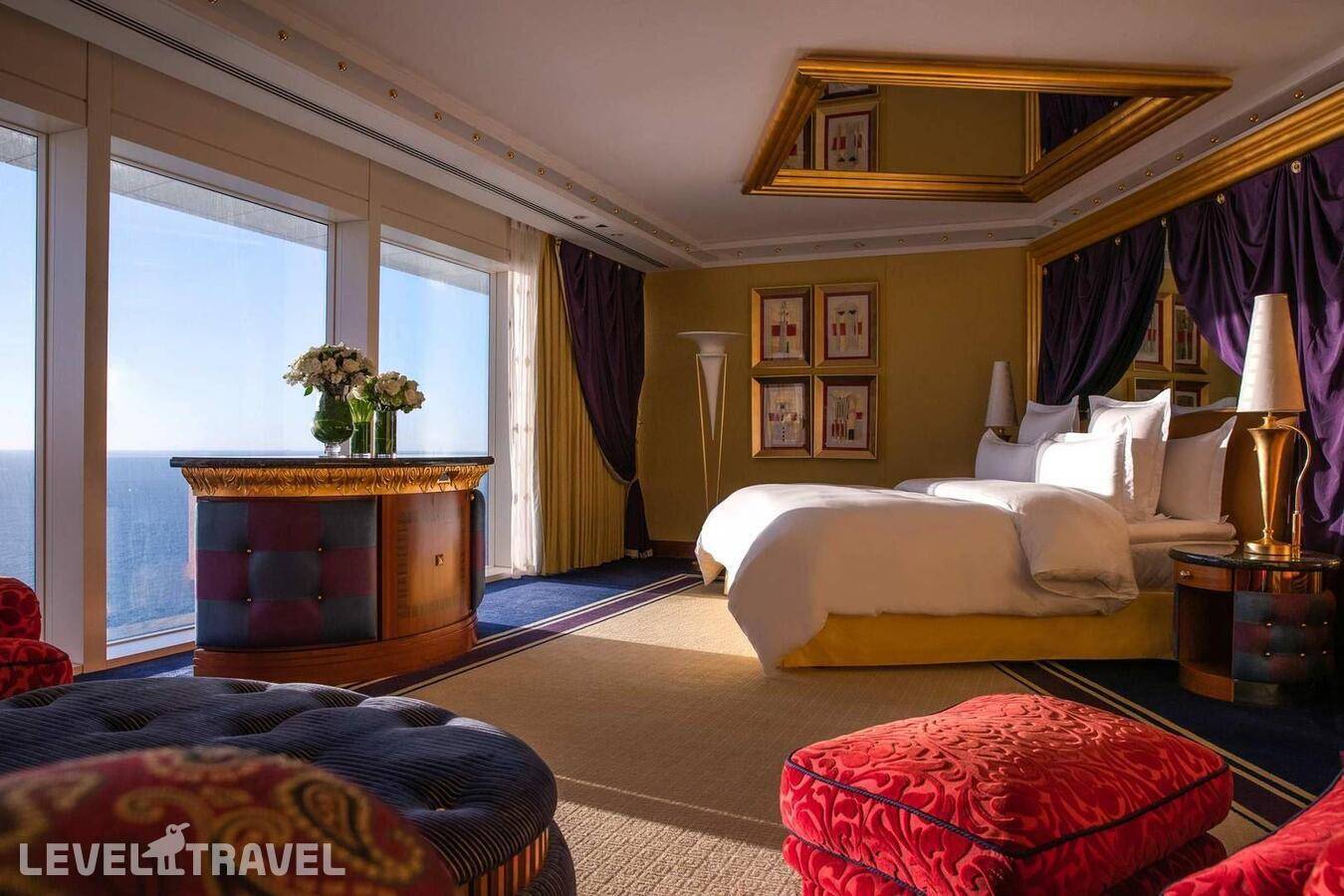 Шикарный люкс: просторная гостиная, зона столовой с обеденным столом на 4 человек, туалет для гостей, барная стойка, 2-й этаж – спальня, ванная комната с джакузи, гардеробная. Двуспальная кровать. Панорамные окна от пола до потолка с 180-градусным обзором на панораму Дубая и Персидский залив, бесплатные услуги дворецкого.