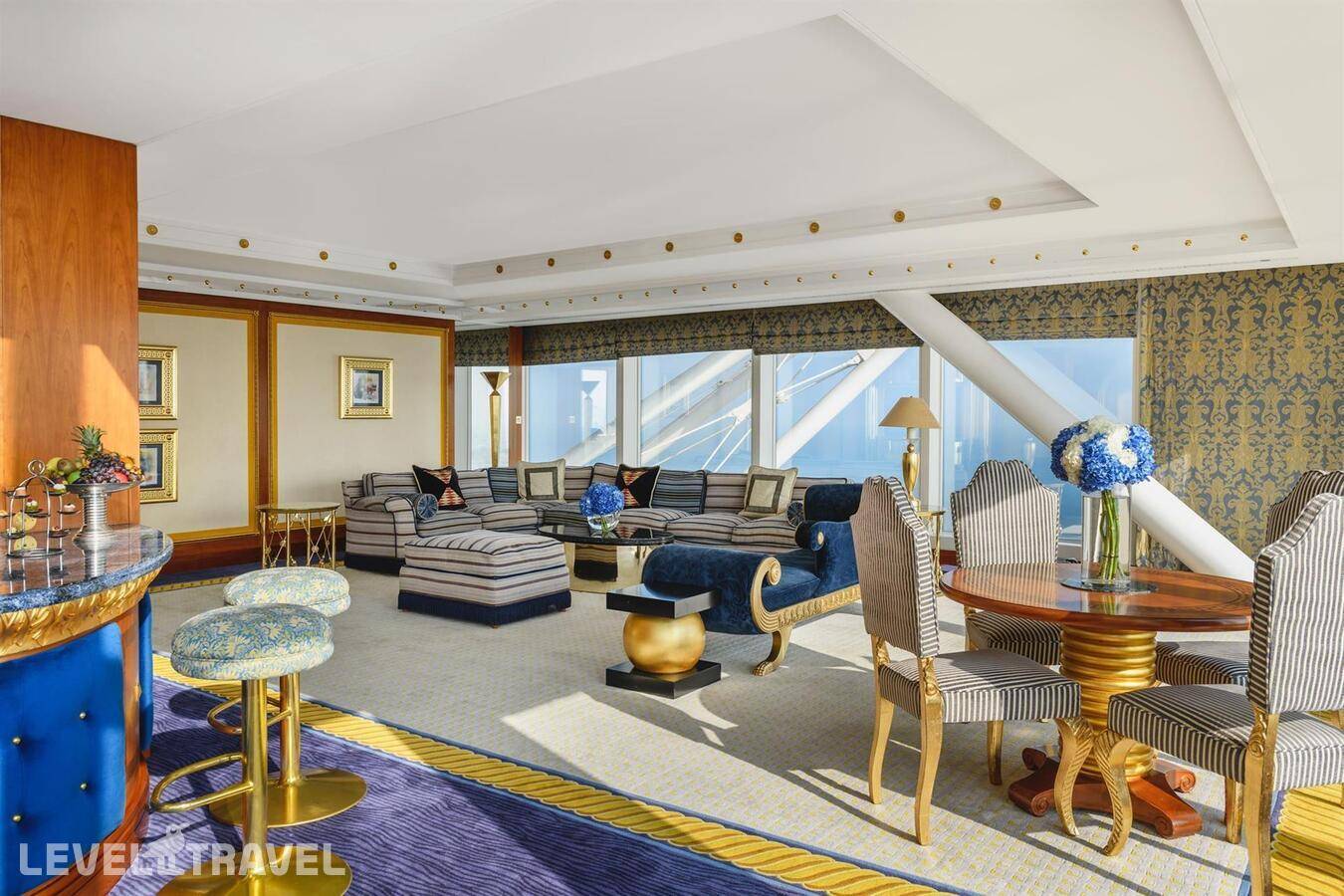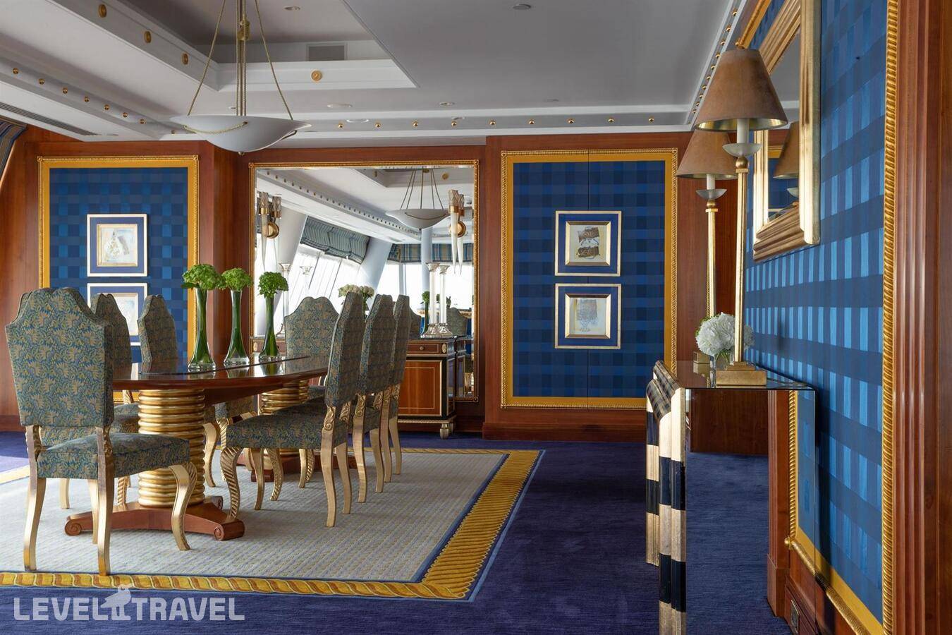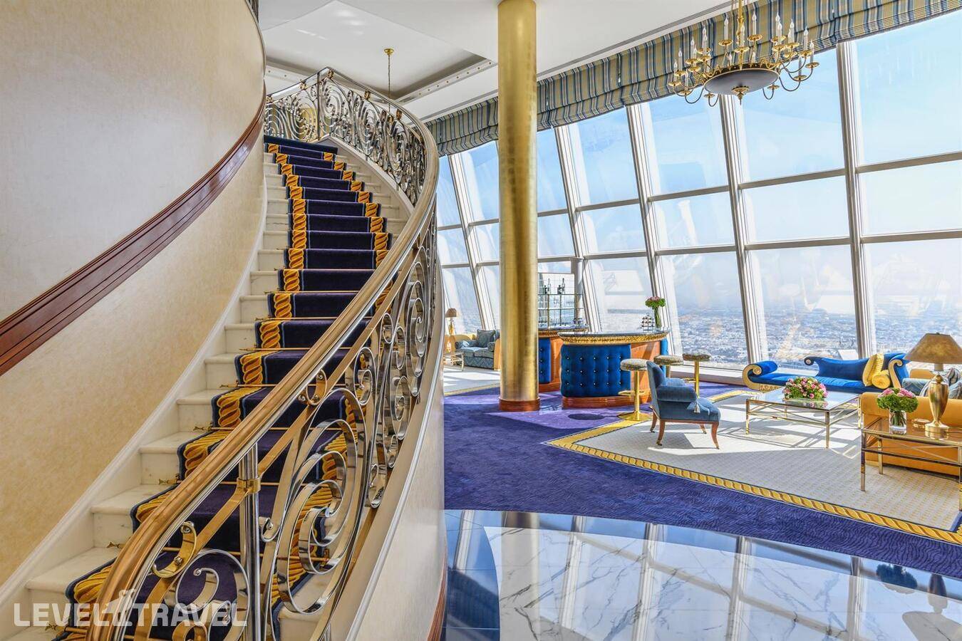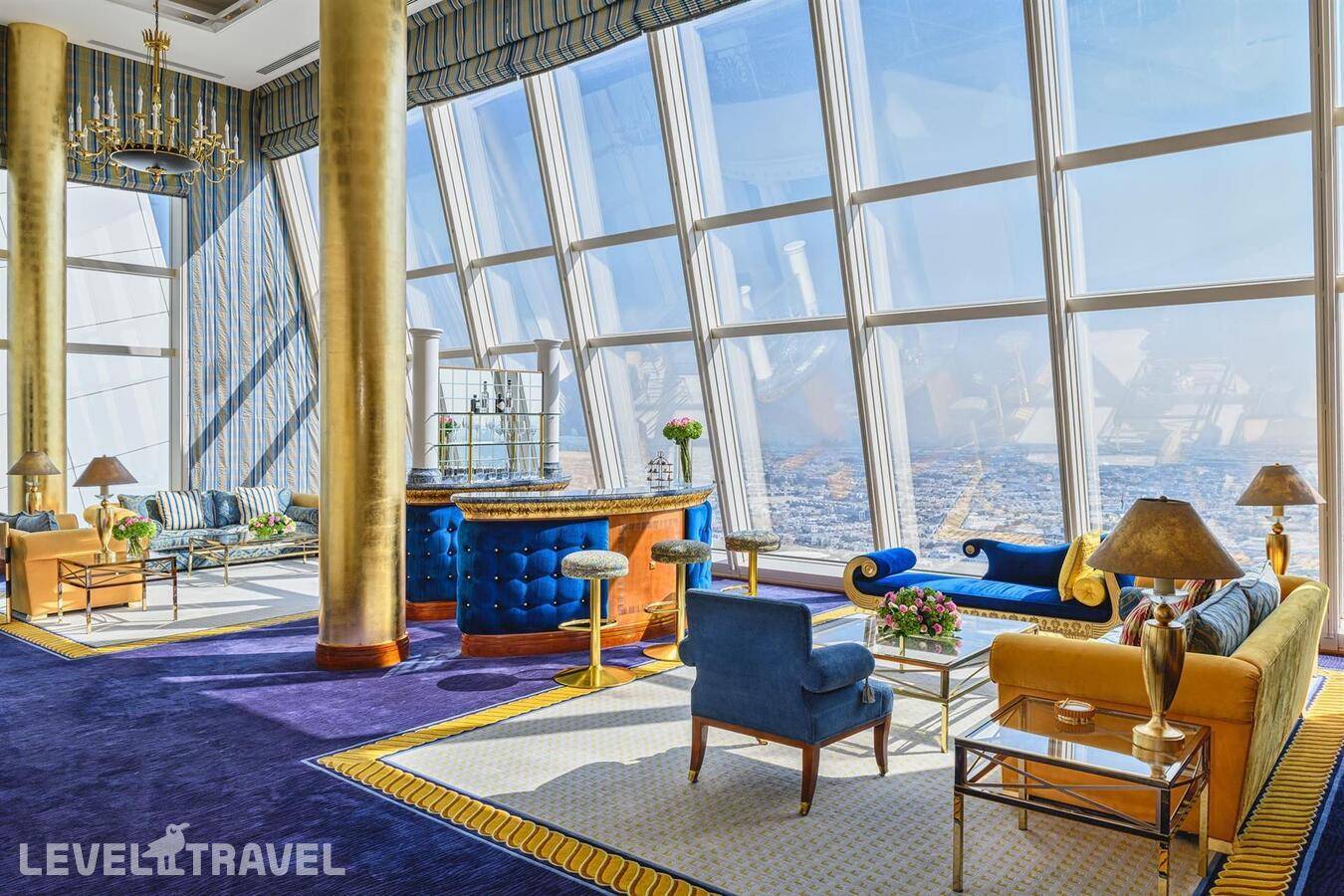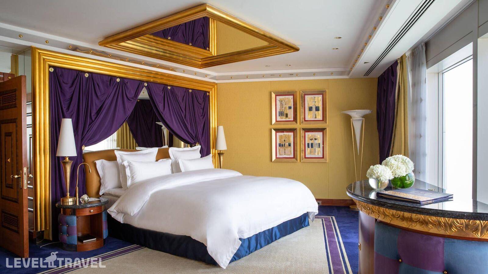 Шикарный люкс: просторная гостиная, зона столовой с обеденным столом на 4 человек, туалет для гостей, барная стойка, 2-й этаж – спальня, ванная комната с джакузи, гардеробная. Двуспальная кровать. Панорамные окна от пола до потолка с 180-градусным обзором на панораму Дубая и Персидский залив, бесплатные услуги дворецкого.