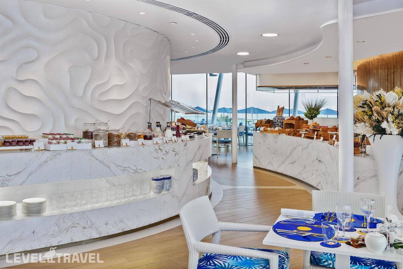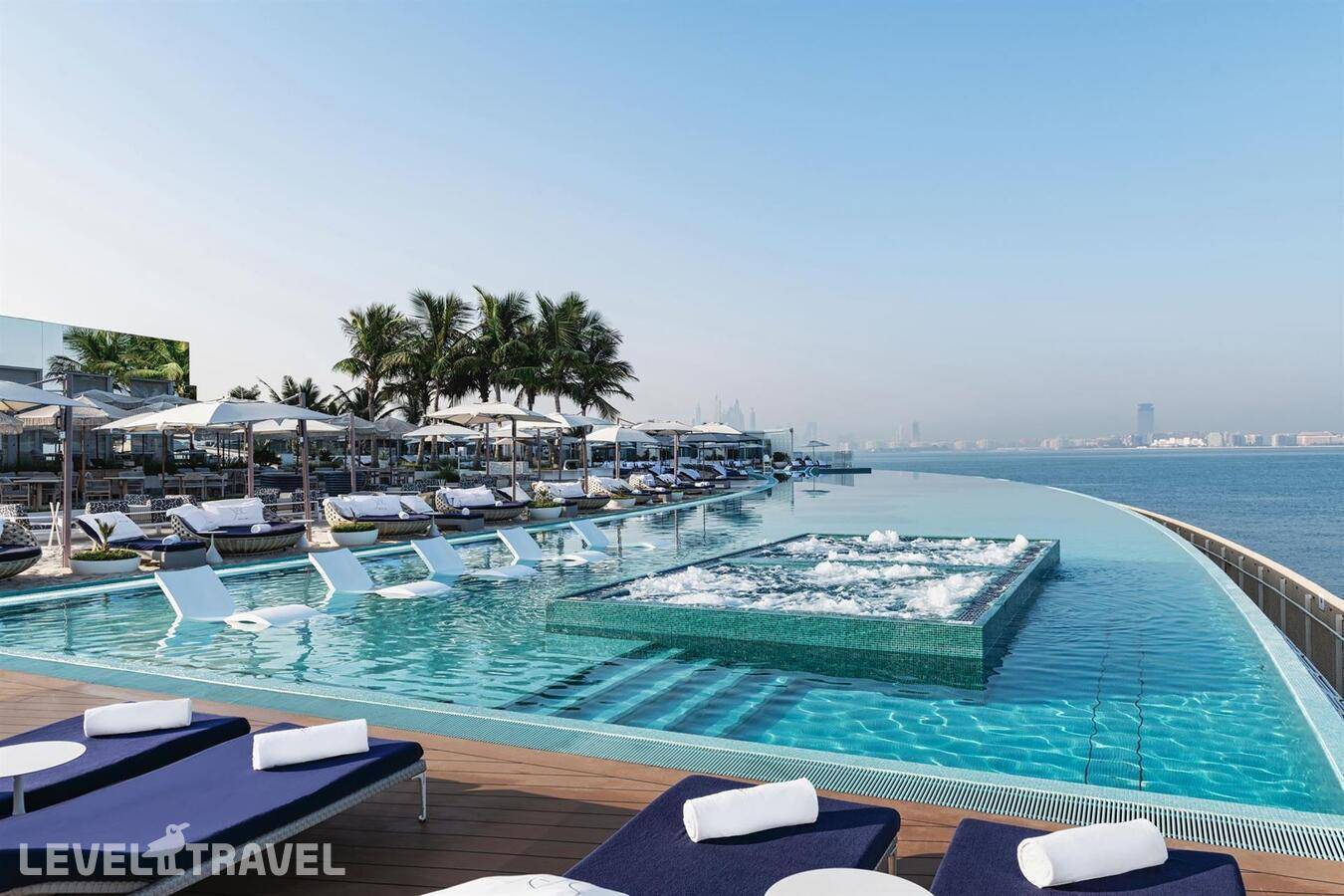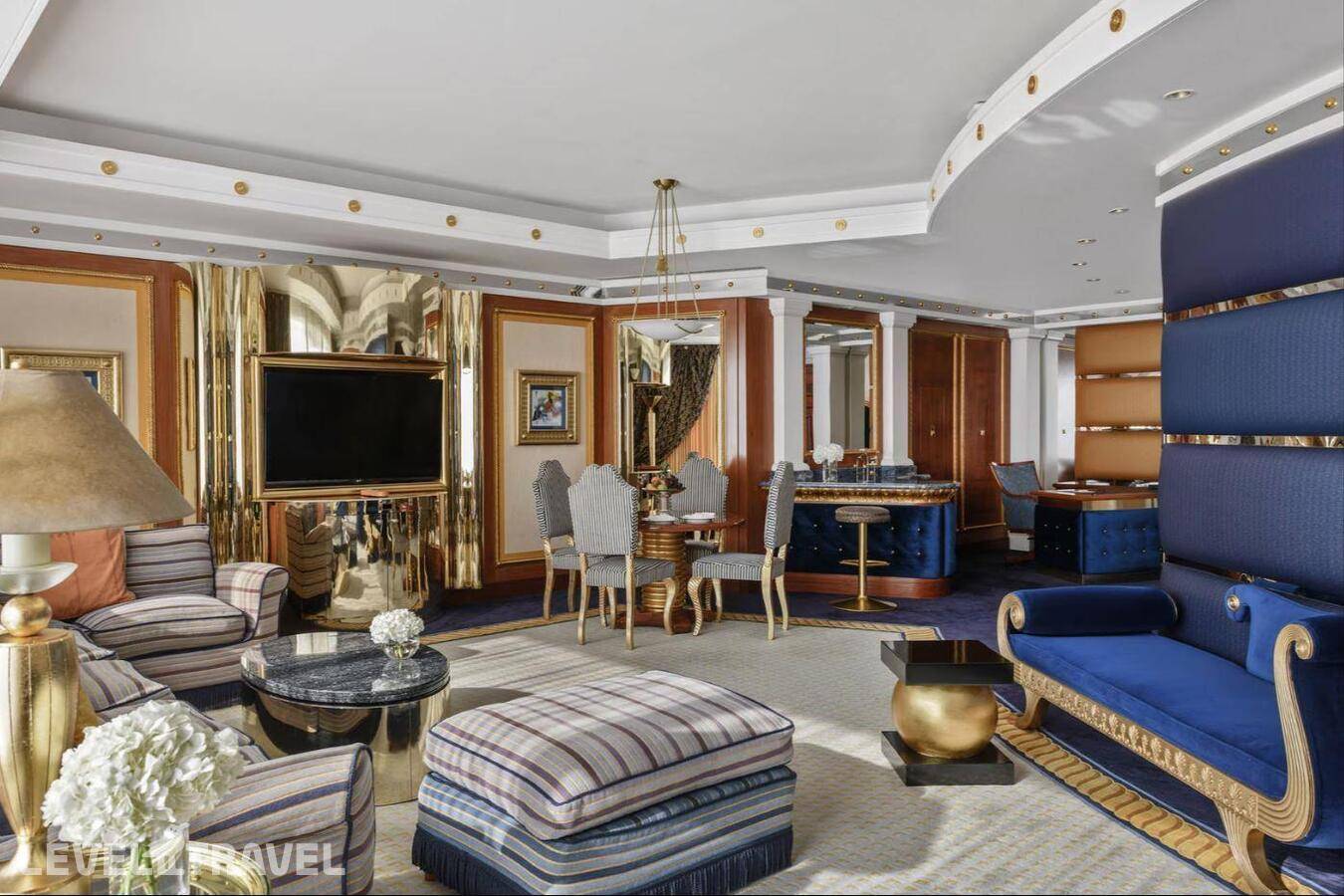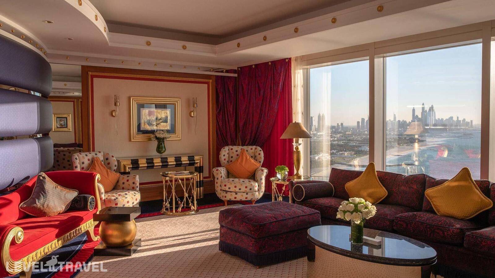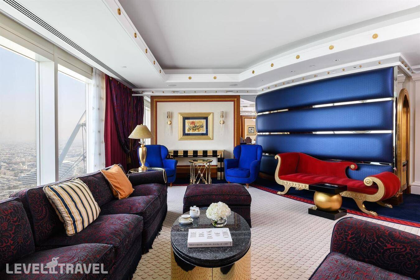 Шикарный люкс: просторная гостиная, зона столовой с обеденным столом на 4 человек, туалет для гостей, барная стойка, 2-й этаж – спальня, ванная комната с джакузи, гардеробная. Двуспальная кровать. Панорамные окна от пола до потолка с 180-градусным обзором на панораму Дубая и Персидский залив, бесплатные услуги дворецкого.