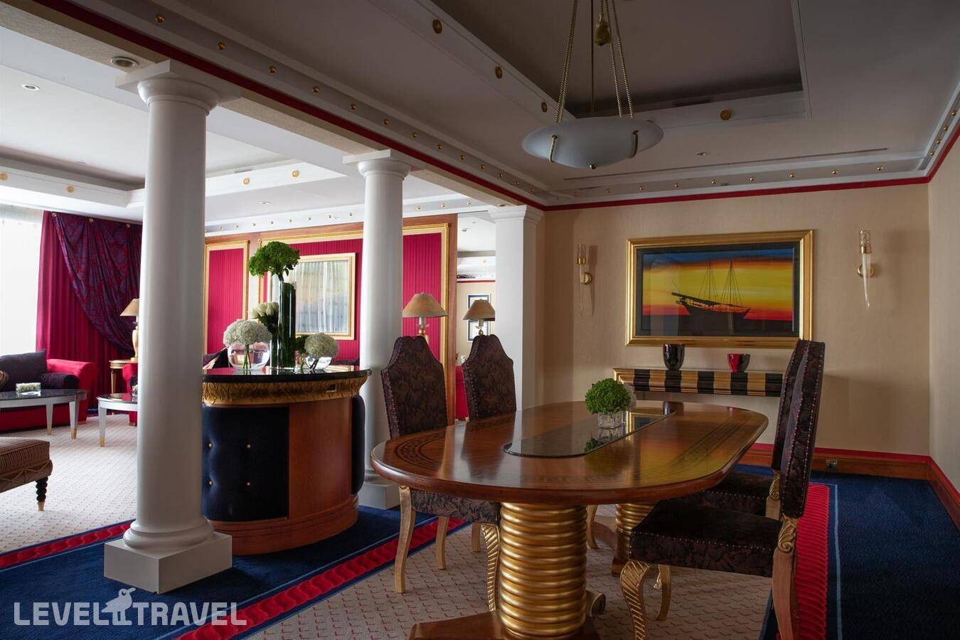 Роскошный номер с видом в сторону Марины и Пальмы. Двуспальная кровать. Персональный бар и бильярдный стол в номере.