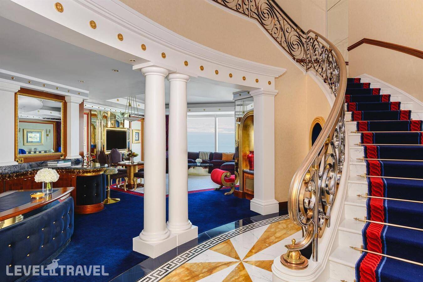 Первоклассный двухэтажный номер с двумя спальнями. 1-й этаж - гостиная, столовая зона с обеденным столом на 6 персон, отдельный вход для дворецкого, туалет для гостей, рабочий стол, компьютер iMac, персональное многофункциональное устройство, совмещающее в себе принтер, ксерокс, сканер и факс, 2-й этаж – гардеробная, 2 спальни с дверьми (одна с двуспальной кроватью, вторая с двумя односпальными), в каждой спальне ванная комната с ванной-джакузи и ливневым душем.