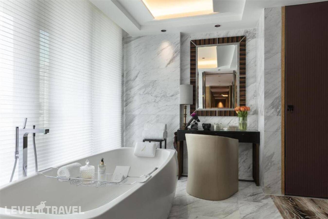 В номере – спальня, гостиная и рабочая зона. Рядом со спальней находится мраморная ванная комната с ванной и отдельной душевой кабиной. С балкона открывается вид на горизонт.