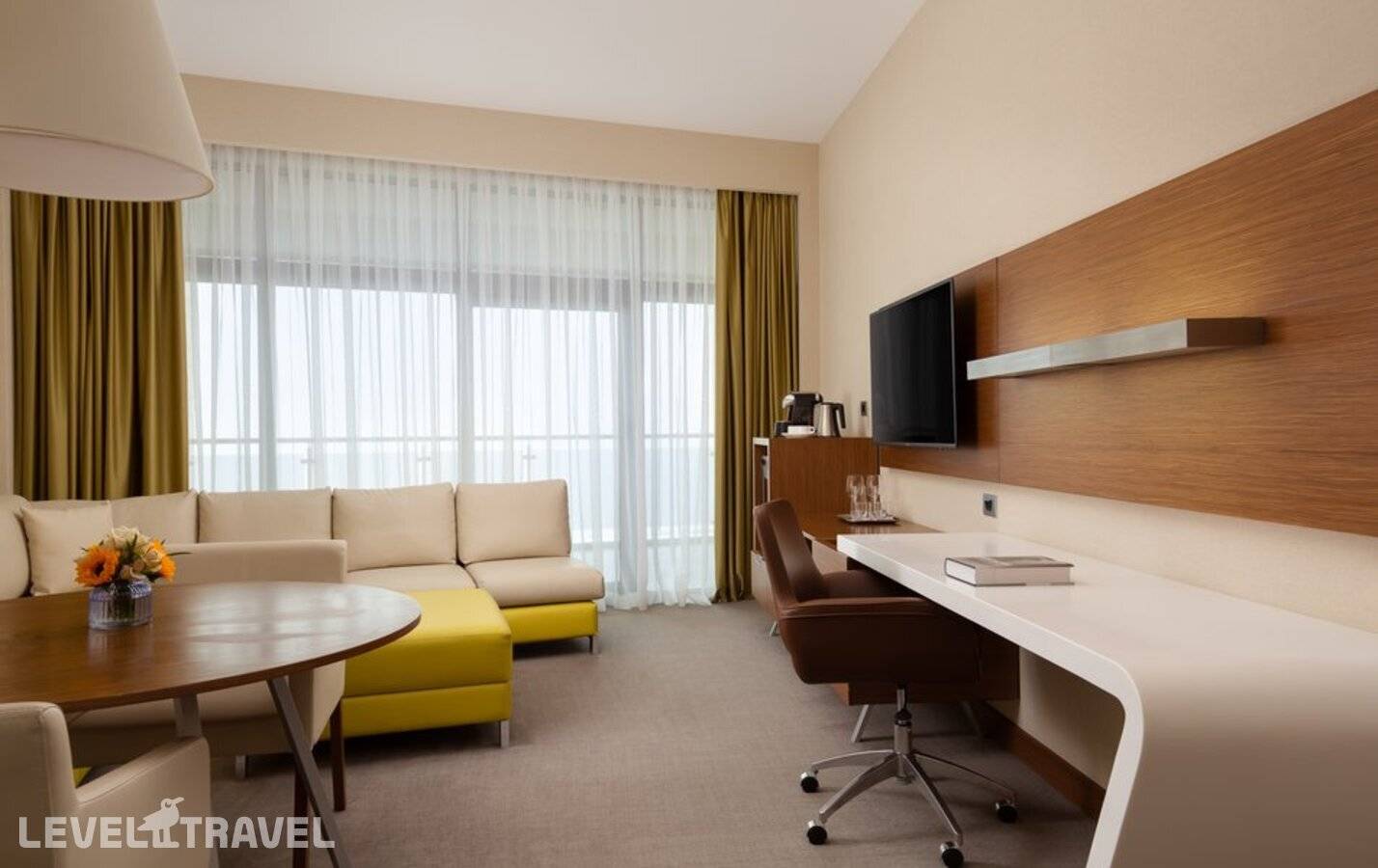 Уютный двухкомнатный номер с отдельными спальней и гостиной. Расположение с третьего по седьмой этаж основного здания. В каждом номере два балкона. В гостиной предусмотрены рабочее место, зона отдыха и обеденная зона.