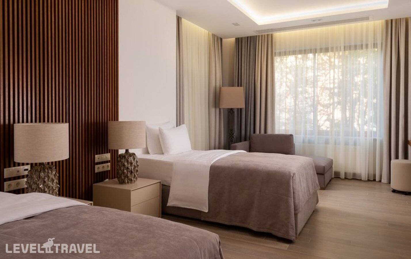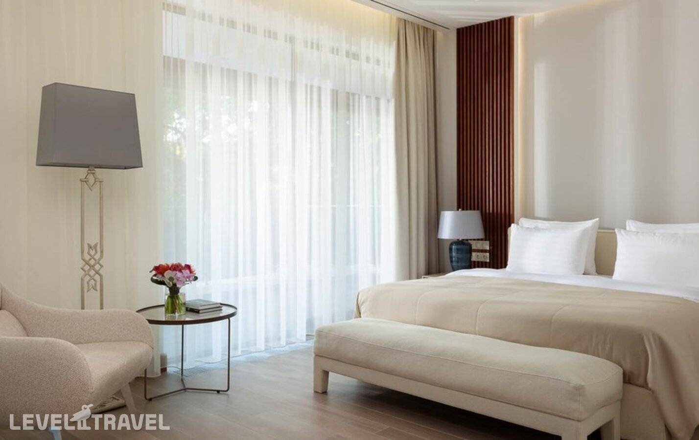 Элегантный номер с видом на парк и море, с гостиной и спальней с двуспальной/двумя односпальными кроватями. Имеется одна дополнительная кровать. Гостиная включает уютную зону отдыха с мягкой мебелью, рабочую поверхность и обеденную зону. Стильный дизайн в сочетании с натуральными материалами отделки, два роскошных балкона с плетеной мебелью, атмосфера уединенности и умиротворения – удовлетворит самого искушенного гостя. Расположение: 2 этаж бунгало.