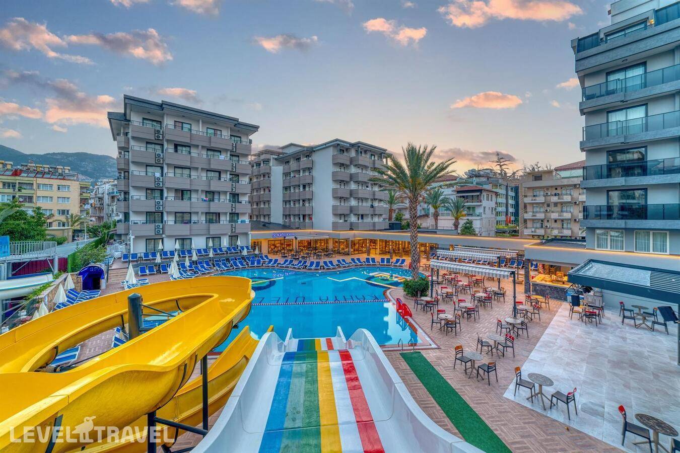 Построен: 1998 г. Реновация: 2007 г. Расположен: в 500 м от центра города Алания. Международный аэропорт Анталии находится в 135 км от отеля. Состоит из трех 5-этажных блоков (блок А и два блока Б). Всего 250 номеров. Общая площадь: 5 000 кв.м. Пляж: собственная территория на общественном песчаном пляже, находится в 130 м от отеля, вторая береговая линия через дорогу. Шезлонги, зонтики, матрацы - платно, пляжных полотенец нет. Заход в море - песок. Бара на пляже нет. Номер телефона: +90 242 513 10 14. Адрес: Saray Mahallesi, Nergiz Sk. No:24, 07400 Alanya/Antalya. Отель не размещает гостей с ограниченными физическими возможностями. Отель не принимает к размещению одиноких мужчин. Заселение с 12:30 Выезд до 11:30