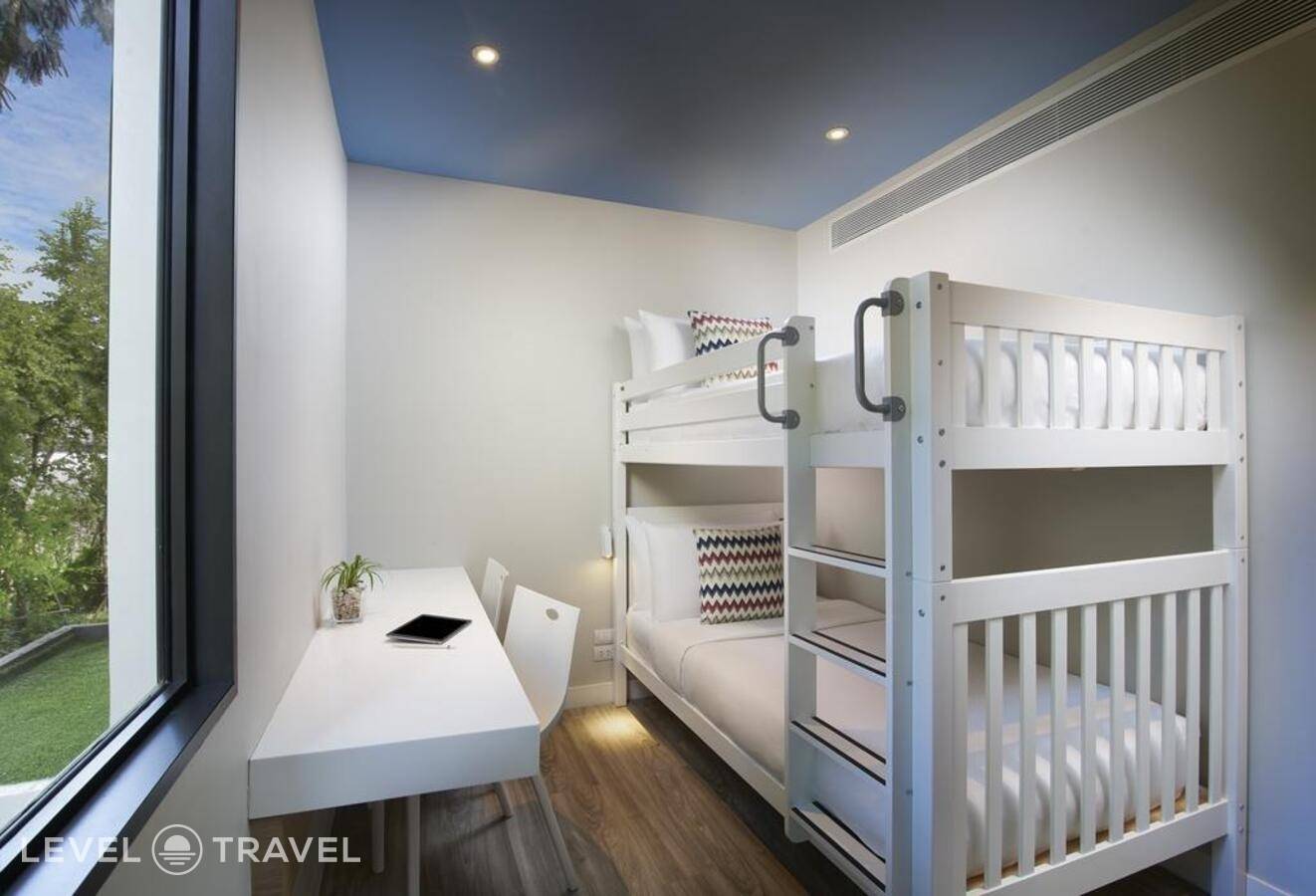 Комфортный семейный номер. В номере одна двуспальная кровать и одна двухъярусная кровать.