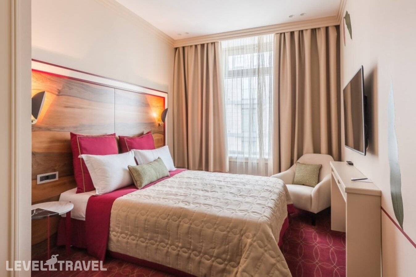 Номер разделен на 2 зоны, что придает ощущение открытого, но в то же время уютного пространства. Окна выходят в тихий внутренний дворик отеля. Номера данной категории располагают большой двуспальной кроватью и просторной ванной комнатой с подогреваемым полом