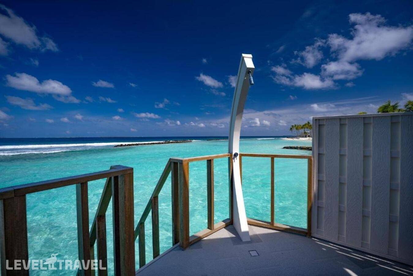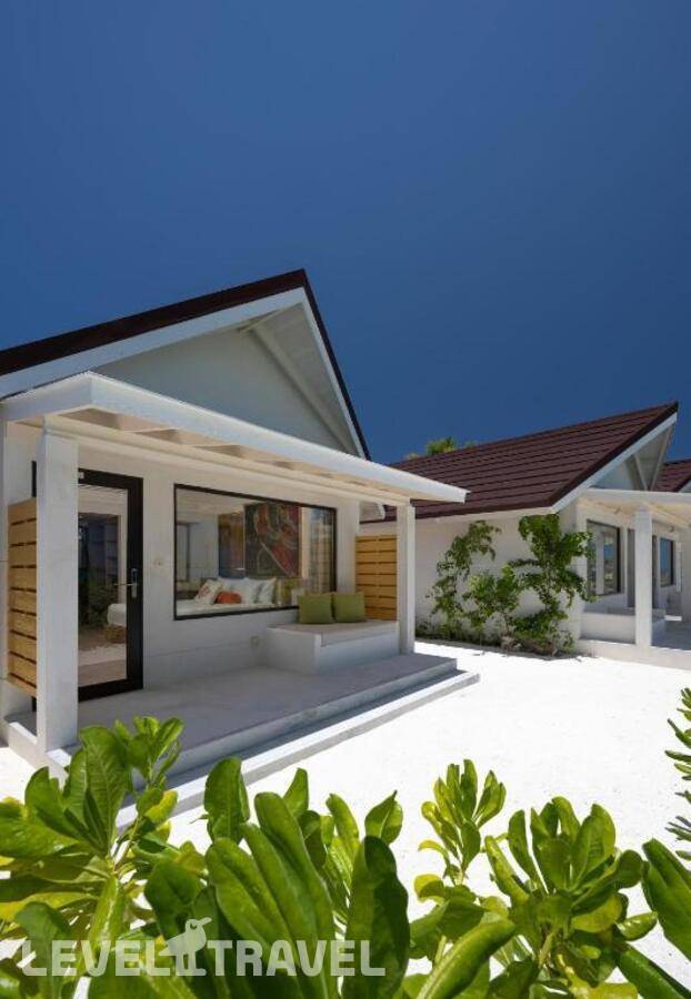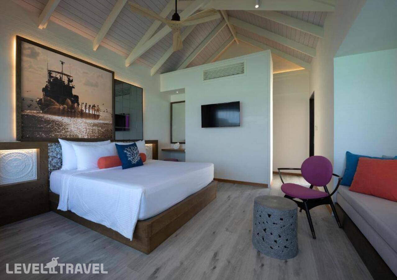 Элегантная вилла на воде, выполненная в форме традиционной мальдивской лодки Дони. Спальня с двуспальной кроватью. Ванная комната частично открытая, с душем. Терраса со спуском с воду.