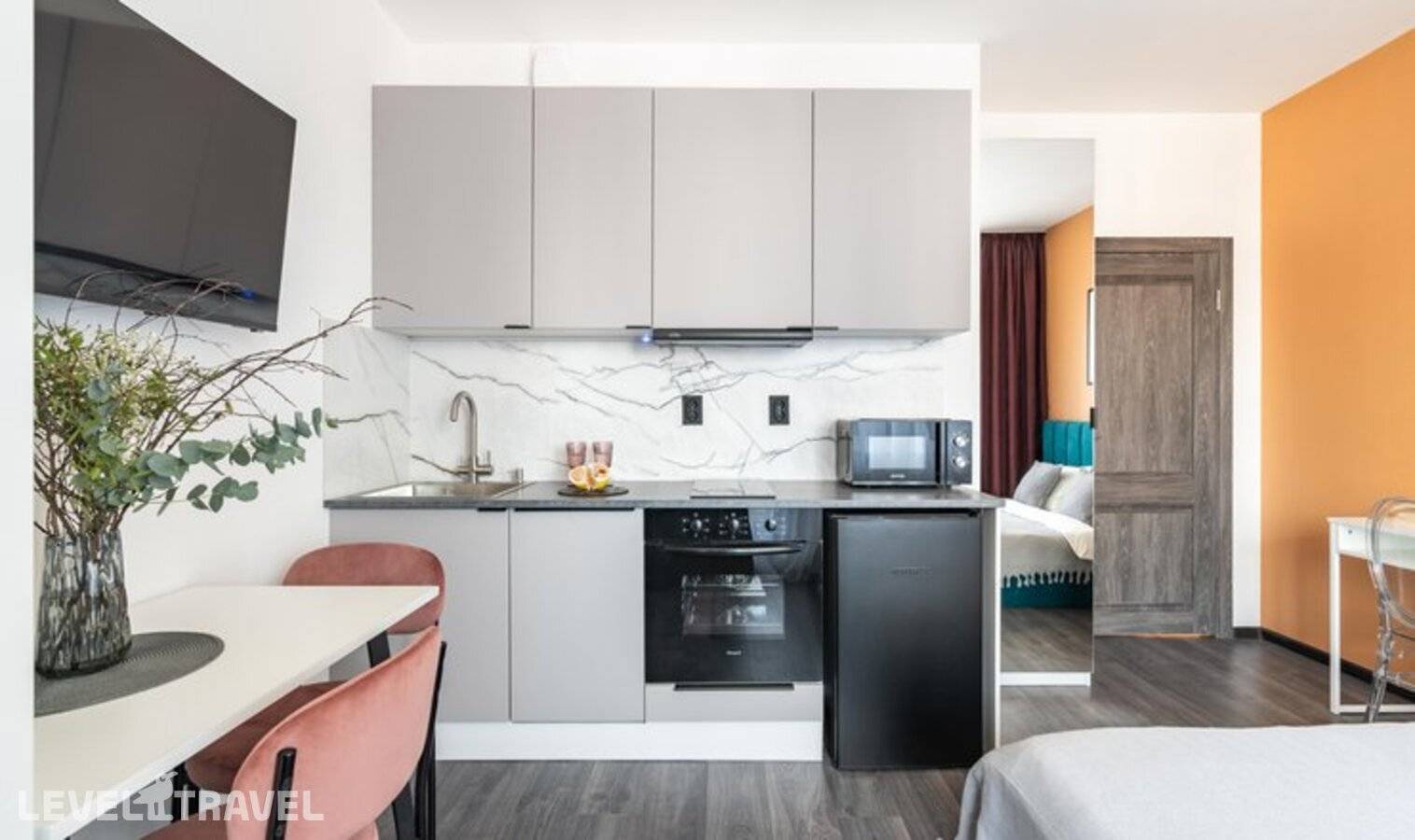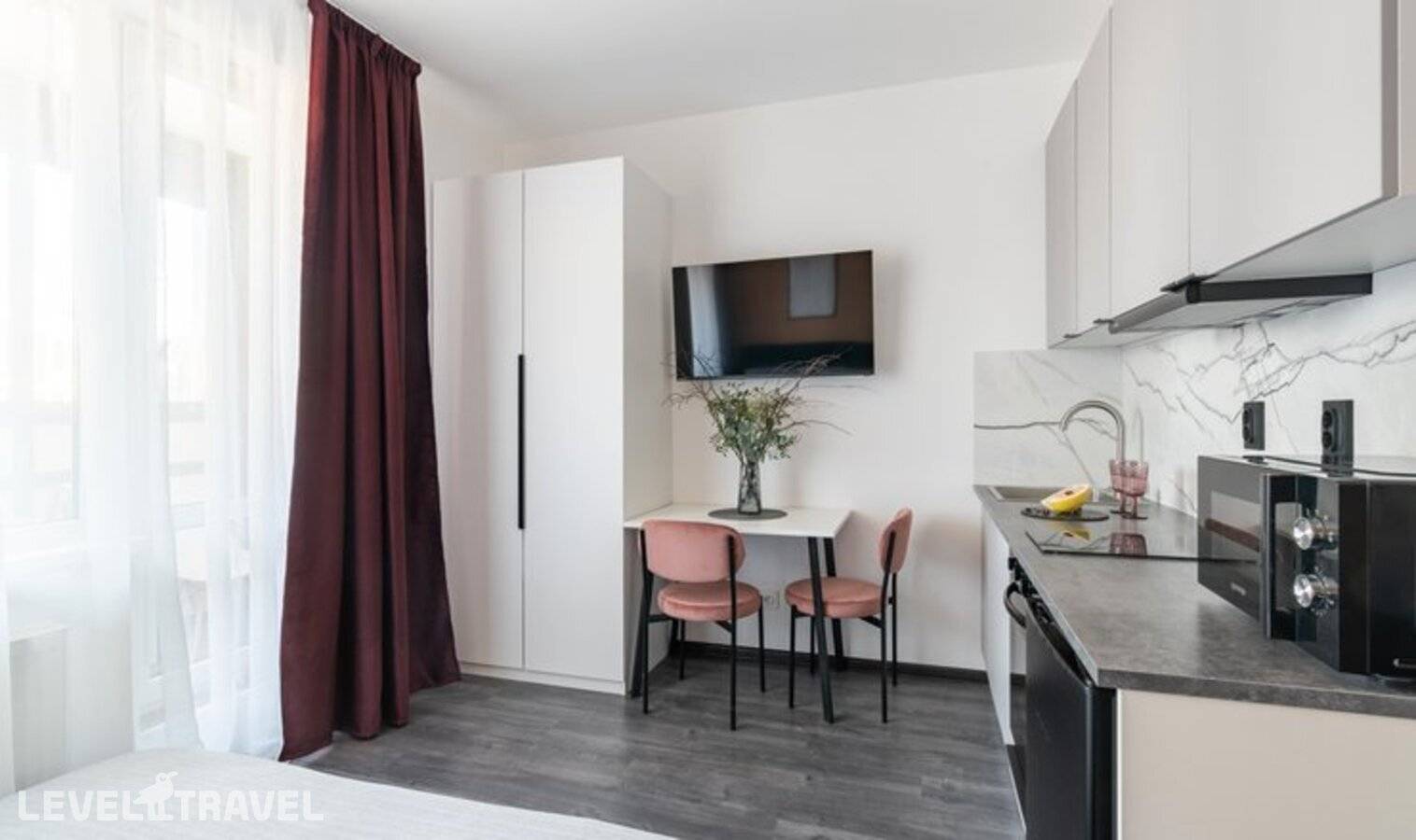 от 20 468 ₽В апартаментах есть все необходимое для комфортного проживания. Удобная и современная мебель, санузел с душевой кабиной. Апартаменты оборудованы мини-кухней с духовым шкафом, электроплитой, посудомоечной машиной, мини-холодильником, электрочайником, набором посуды. Кроме того, предусмотрены телевизор, стиральная машина, интернет Wi-Fi.