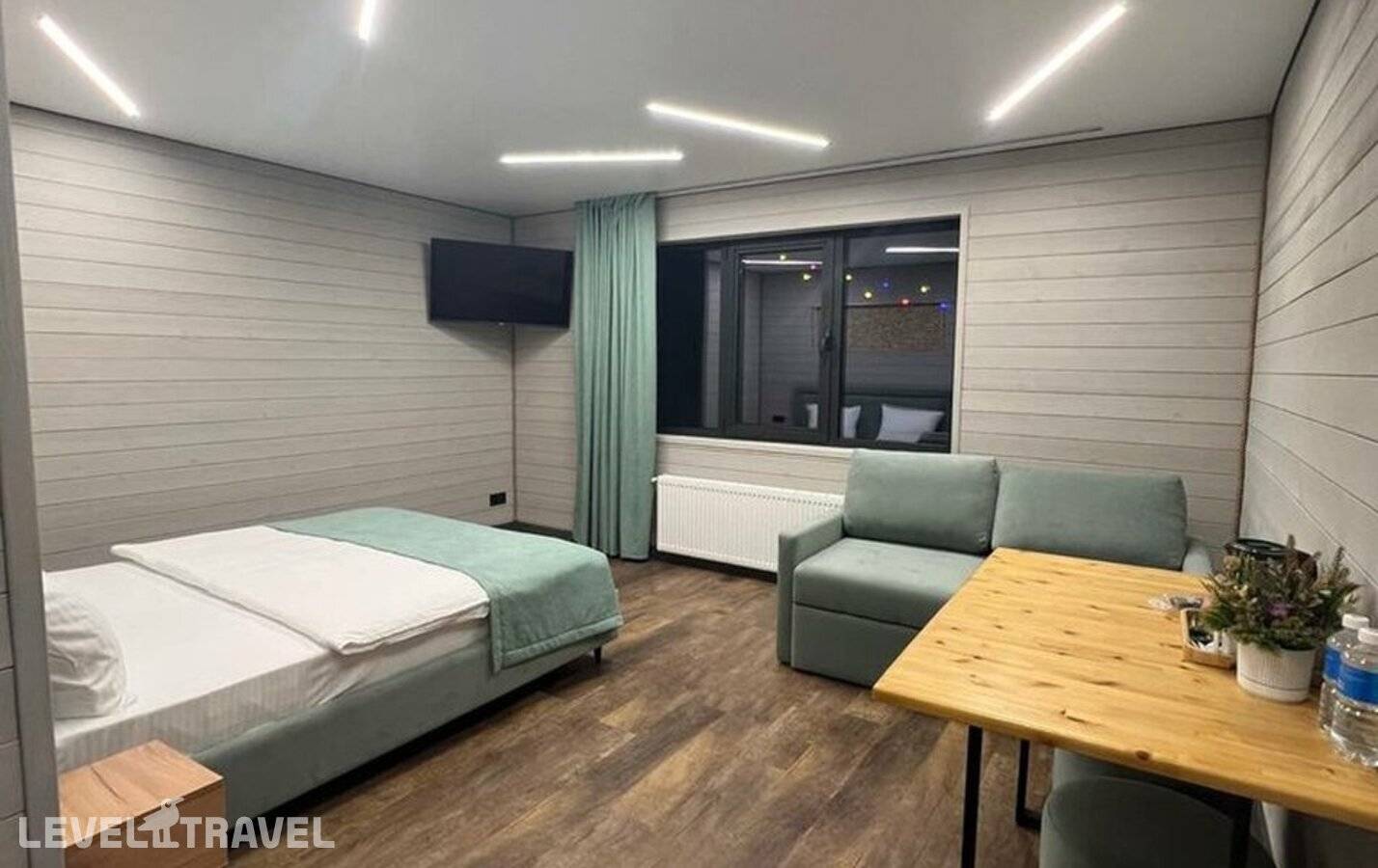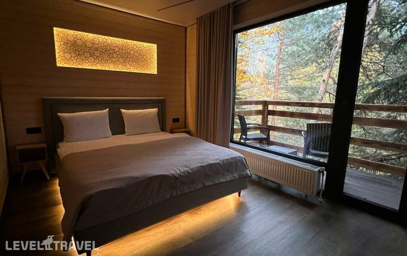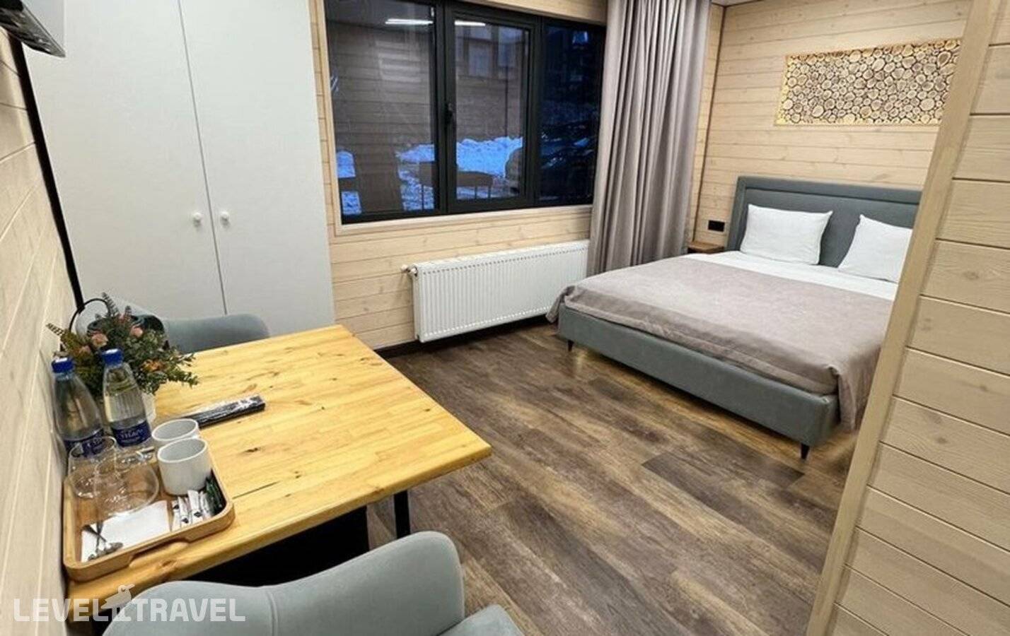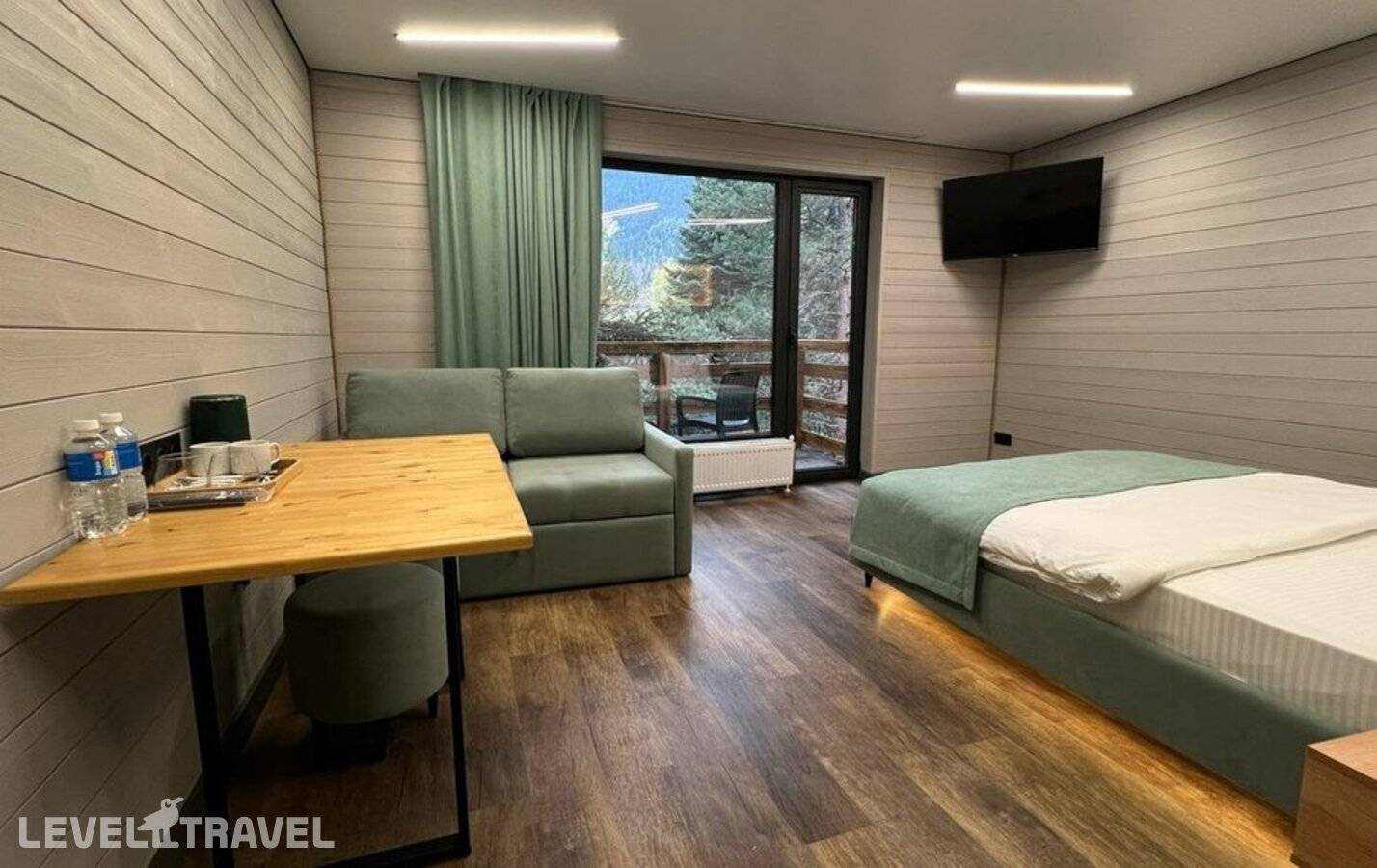 Уютный однокомнатный номер, отделанный деревом. В номере двуспальная кровать. Балкон с видом на горы.