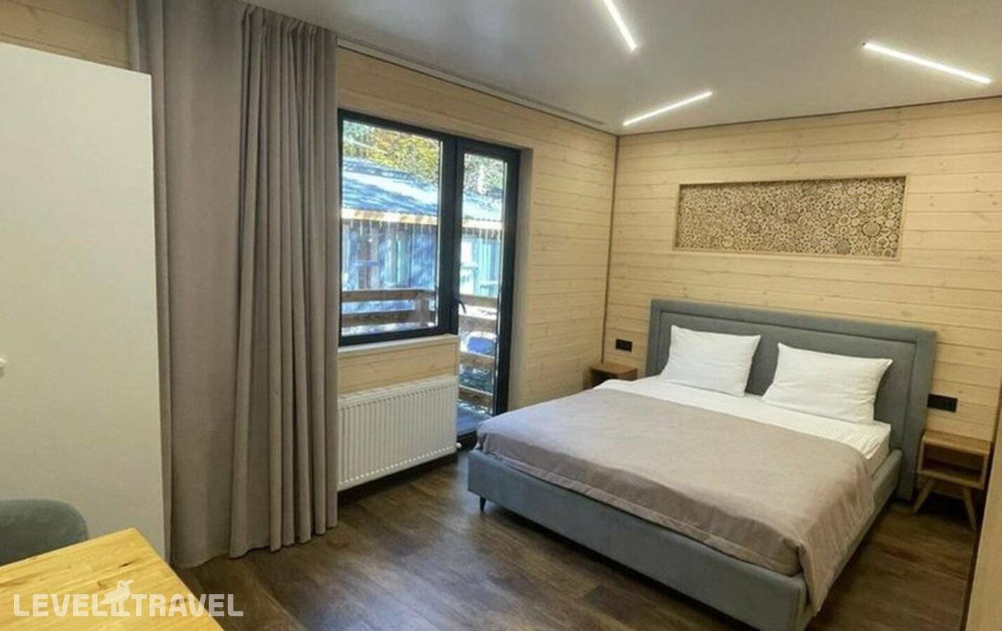 Уютный однокомнатный номер, отделанный деревом. В номере двуспальная кровать. Балкон.
