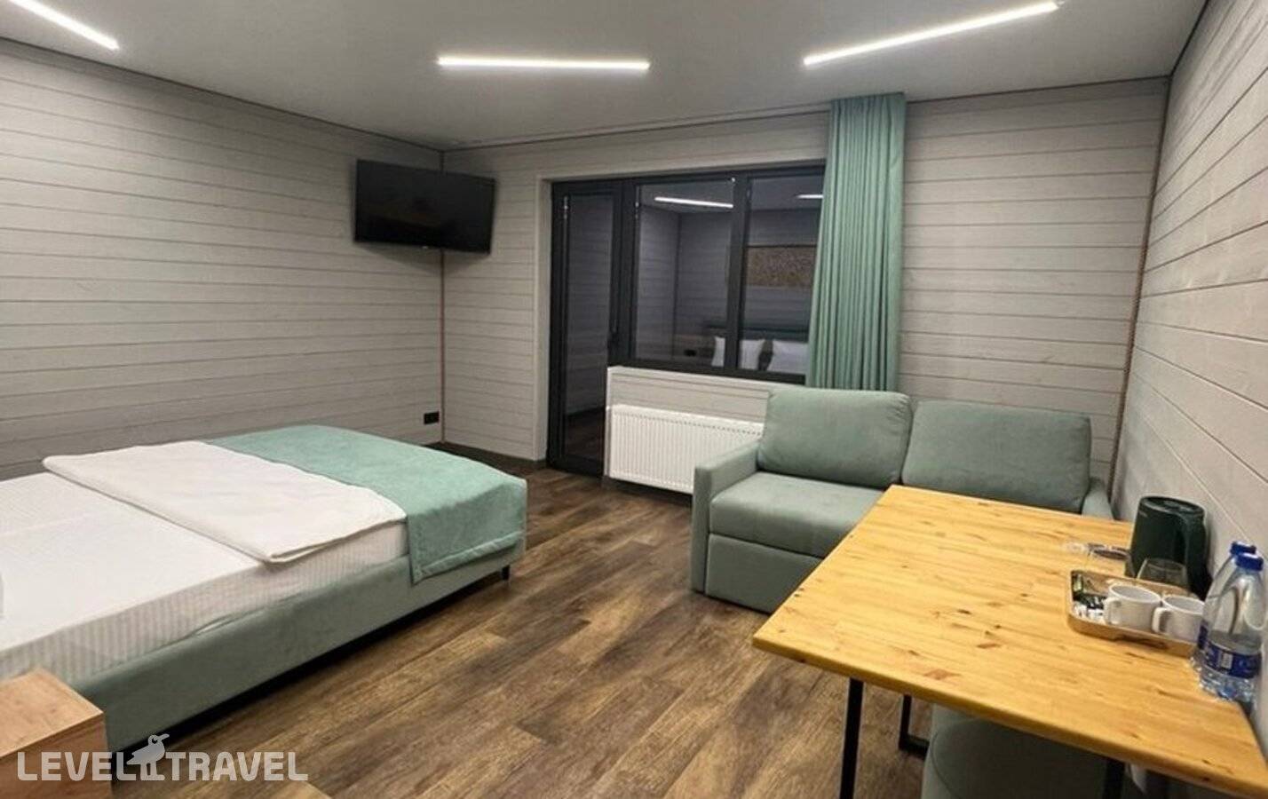 Более просторный номер. В номере двуспальная кровать и диван. Балкон с видом на горы.